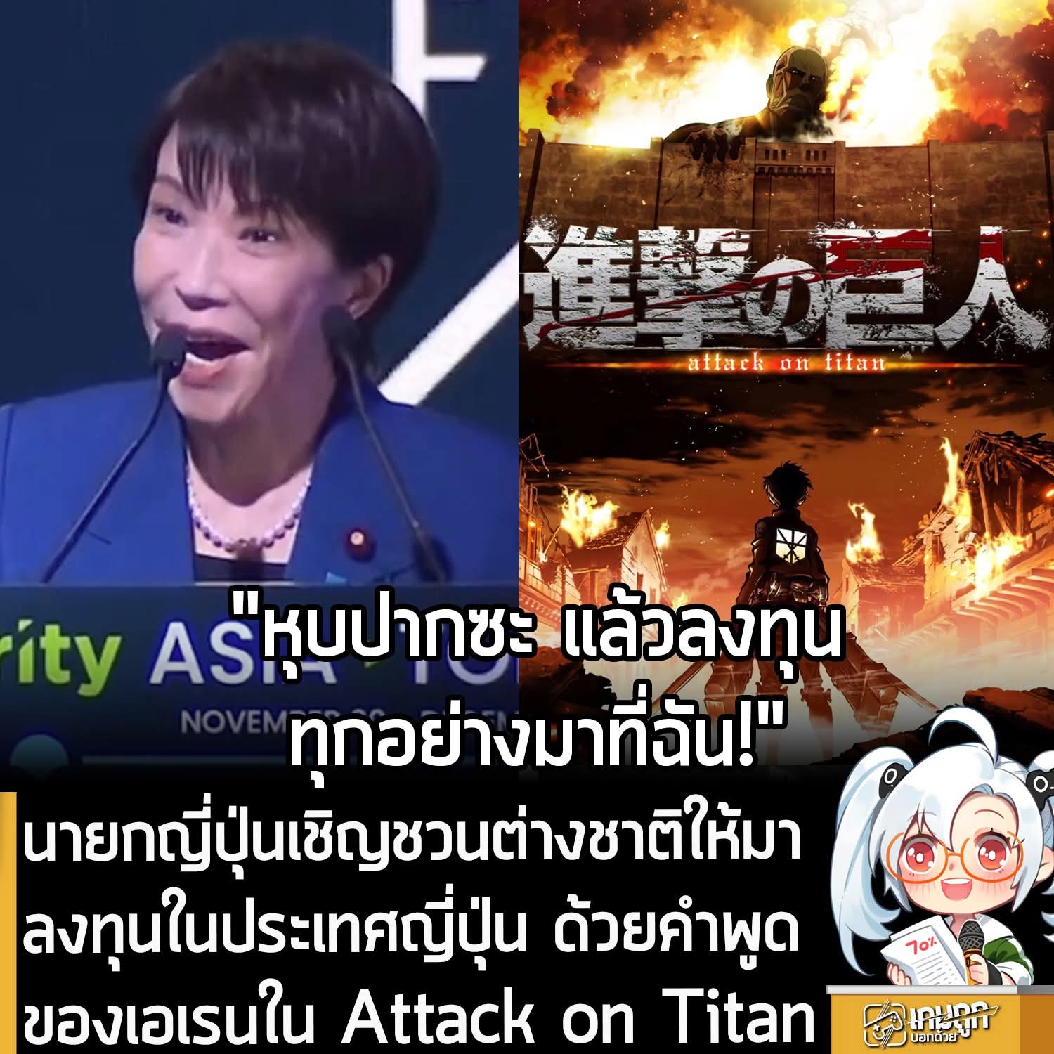 ซึ่งคำพูดดังกล่าวของคุณ Takaichi เป็นคำพูดเดียวกับที่ Eren Yeager ตัวเอกของ Attack on Titan พูดในอนิเมะซีซันแรก ก่อนที่จะโดนเตะปากจนกลายเป็นมีมระดับตำนานของเรื่องนี้