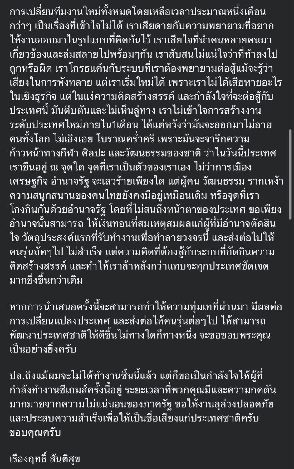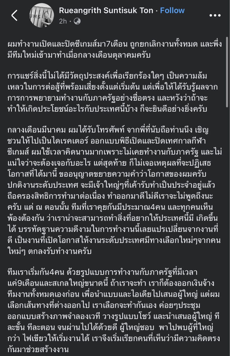 เฟซบุ๊ก “Rueangrith Suntisuk Ton” ของ เรืองฤทธิ์ สันติสุข ได้โพสต์ข้อความร่ายยาว หลังถูกยกเลิกงานพิธีเปิดและปิดซีเกมส์ ครั้งที่ 33 แม้จะเตรียมงานมาแล้วกว่า 7 เดือน