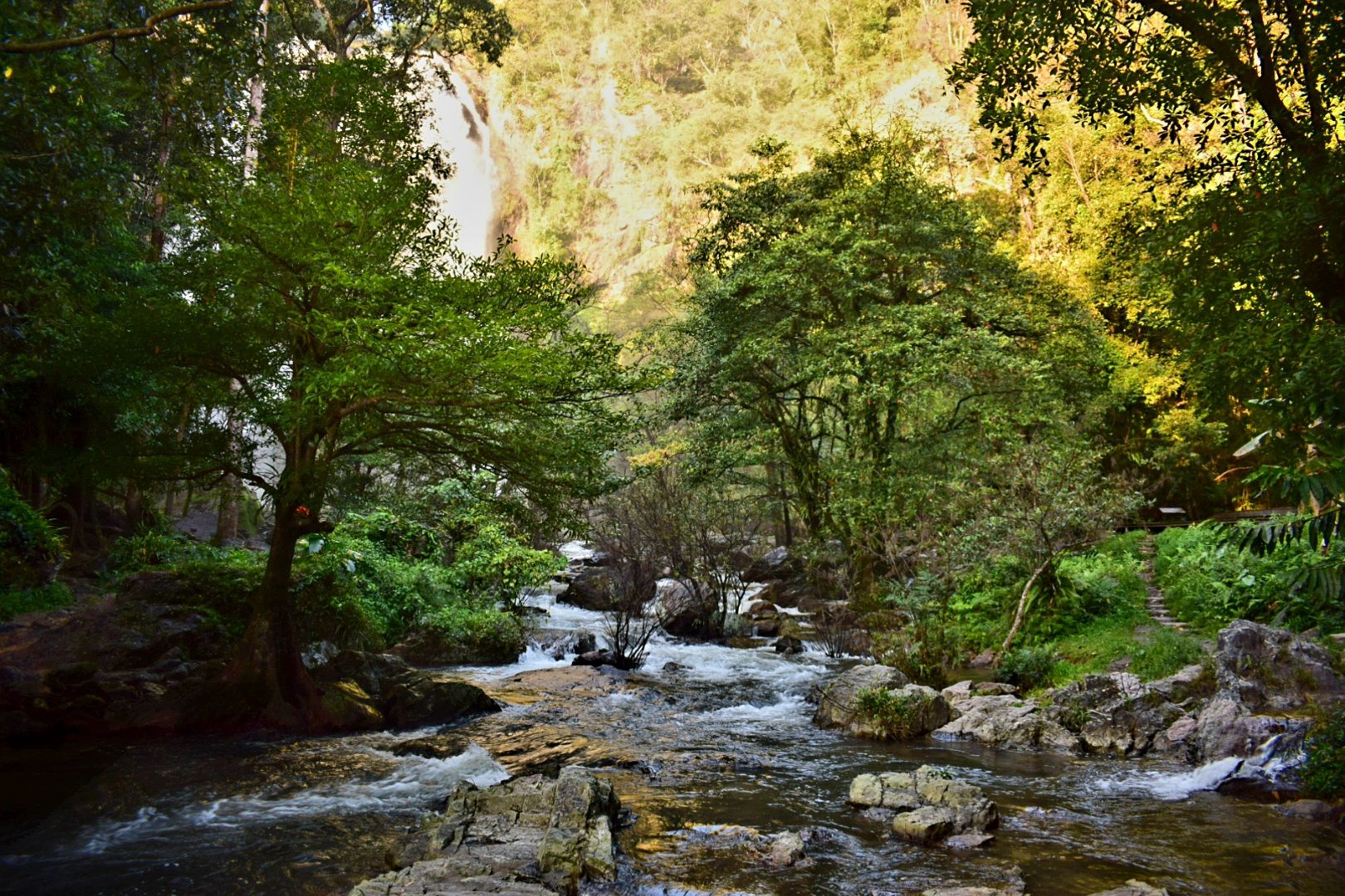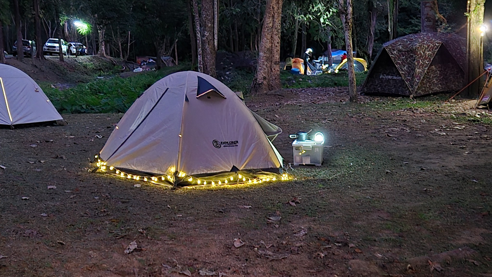 กางเต็นเสร็จแล้วนั่งพักสักแป๊บ อากาศเริ่มเย็นต้องรีบไปอาบน้ำก่อนค่อยมาทำกับข้าวง่าย ๆ คืนนี้ก็นอนฟังเสียงน้ำตกเพลินไป