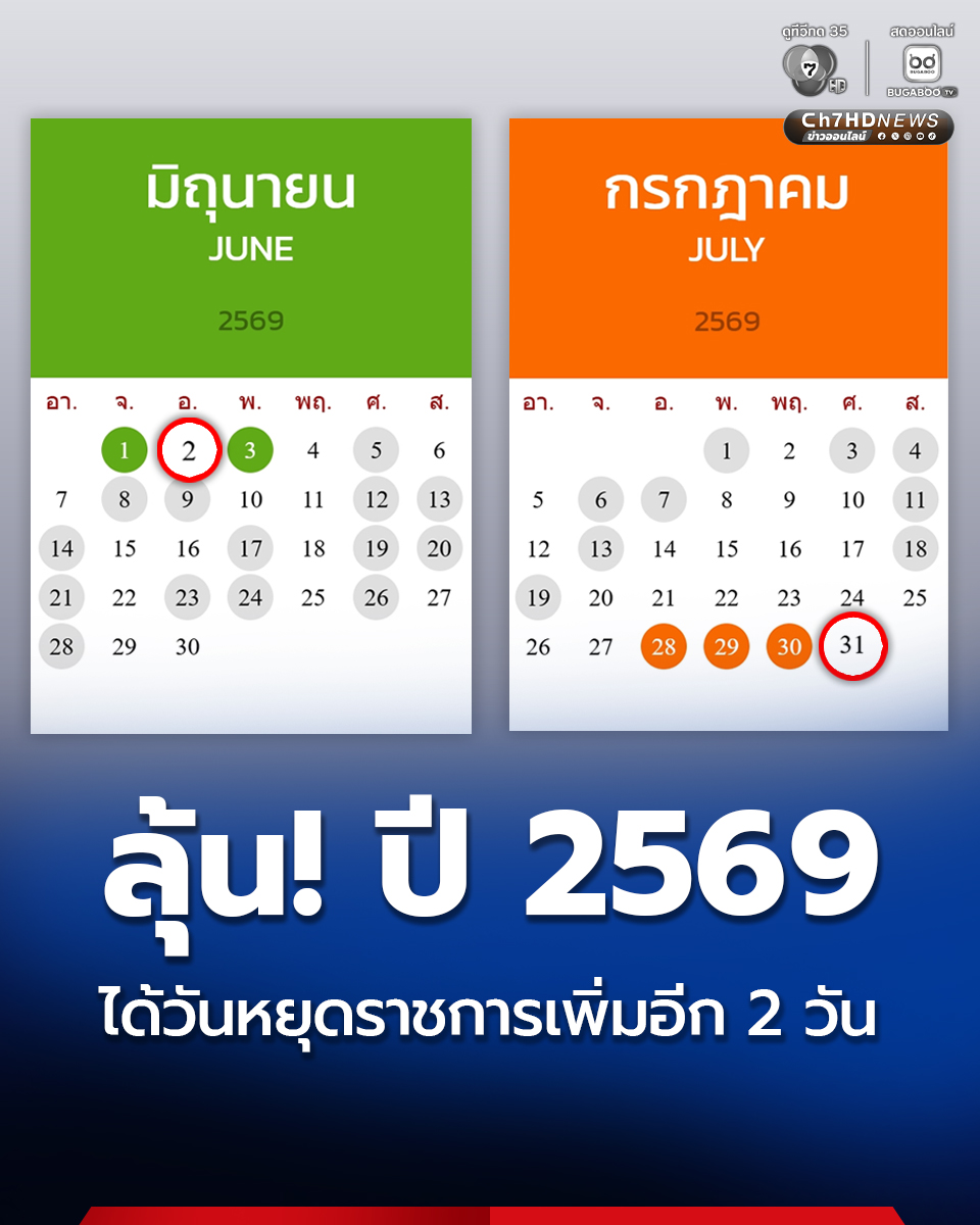 วันที่ 31 กรกฎาคม 2569 ซึ่งจะส่งผลให้มีวันหยุดต่อเนื่องยาวติดต่อกัน 6 วัน คือ วันที่ 28 กรกฎาคม - 2 สิงหาคม 2569