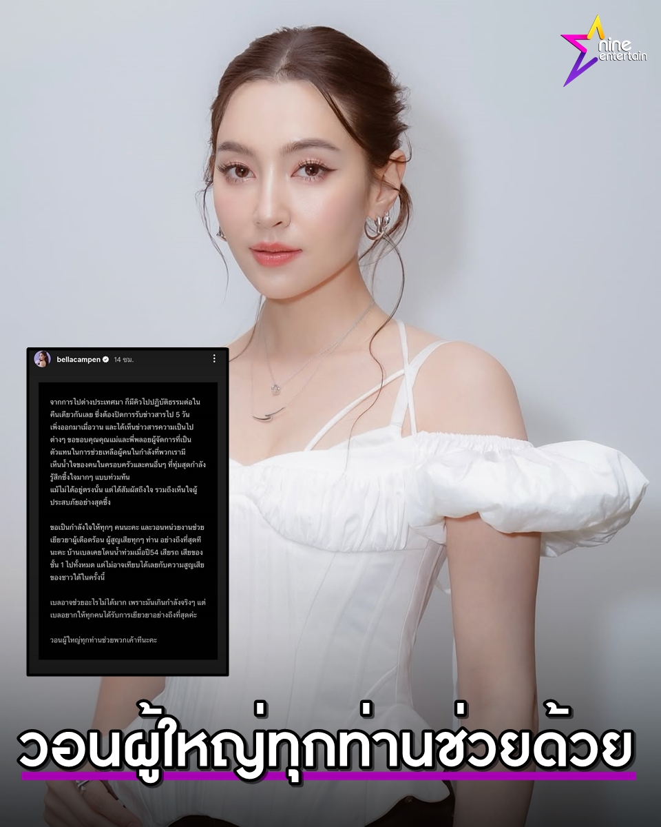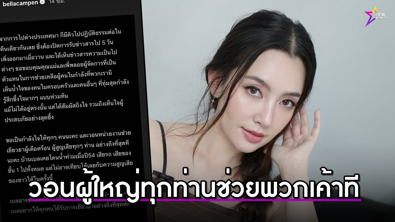 ขอเป็นกำลังใจให้ทุก ๆ คนนะคะ และวอนหน่วยงานช่วยเยียวยาผู้เดือดร้อน ผู้สูญเสียทุก ๆ ท่าน อย่างถึงที่สุดทีนะคะ บ้านเบลเคยโดนน้ำท่วมเมื่อปี 54 เสียรถ เสียของชั้น 1 ไปทั้งหมด แต่ไม่อาจเทียบได้เลยกับความสูญเสียของชาวใต้ในครั้งนี้ เบลอาจช่วยอะไรไม่ได้มาก เพราะมันเกินกำลังจริง ๆ แต่ เบลอยากให้ทุกคนได้รับการเยียวยาอย่างถึงที่สุดค่ะ วอนผู้ใหญ่ทุกท่านช่วยพวกเค้าทีนะคะ".-ไนน์เอ็นเตอร์เทน