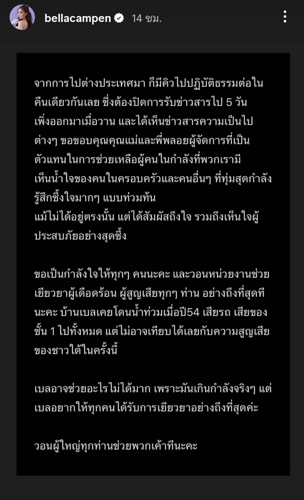 โดย เบลล่า โพสต์ในอินสตาแกรมสตอรี่ ระบุว่า "จากการไปต่างประเทศมา ก็มีคิวไปปฏิบัติธรรมต่อในคืนเดียวกันเลย ซึ่งต้องปิดการรับข่าวสารไป 5 วัน เพิ่งออกมาเมื่อวาน และได้เห็นข่าวสารความเป็นไปต่าง ๆ ขอขอบคุณคุณแม่และพี่พลอยผู้จัดการที่เป็นตัวแทนในการช่วยเหลือผู้คนในกำลังที่พวกเรามี เห็นน้ำใจของคนในครอบครัวและคนอื่น ๆ ที่ทุ่มสุดกำลังรู้สึกซึ้งใจมาก ๆ แบบท่วมท้น แม้ไม่ได้อยู่ตรงนั้น แต่ได้สัมผัสถึงใจ รวมถึงเห็นใจผู้ประสบภัยอย่างสุดซึ้ง