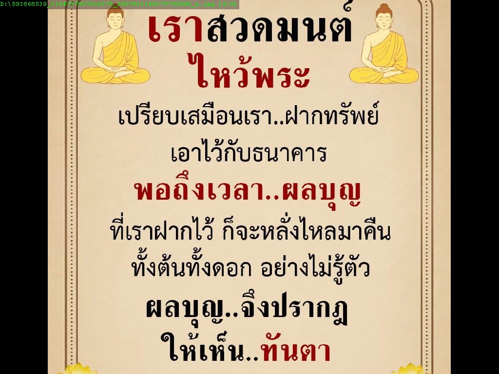 เราสวดมนต์ไหว้พระเหมือนเราฝากทรัพย์ไว้กับธนาคาร พอถึงเวลาผลบุญที่เราฝากไว้ก็จะไหลคืนมาให้เห็นทันตา