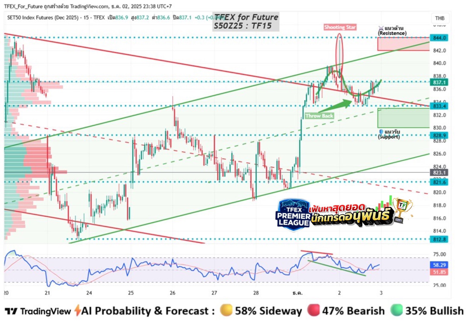 📉 Outlook&Tactical Plan - ช่วงเช้า Candle ลากไปทำ Shooting Star(วงแดง)ให้สัญญาณลง โดยเป็นสร้าง False Break แล้ววกกลับลงมาทดสอบแนวต้านเดิมที่ 835-837 จับตาวันนี้! ถ้ายืนอยู่จะเป็นแค่การพักตัวเพื่อไปต่อ ตามเทรนขาขึ้นระยะสั้น(กรอบเขียว) เพื่อเปิดทางเป็นขาขึ้นแทนขาลงเต็มตัว
