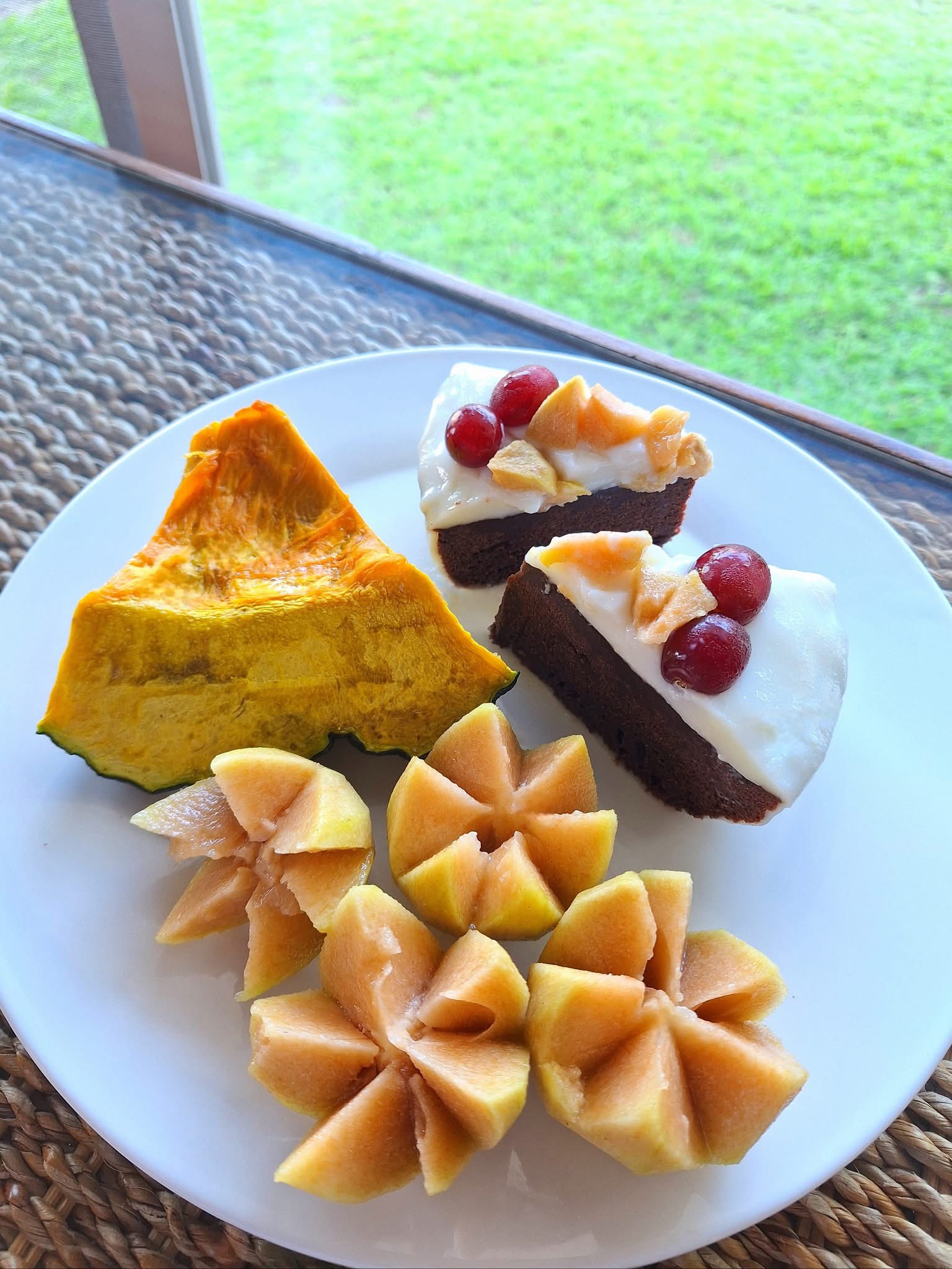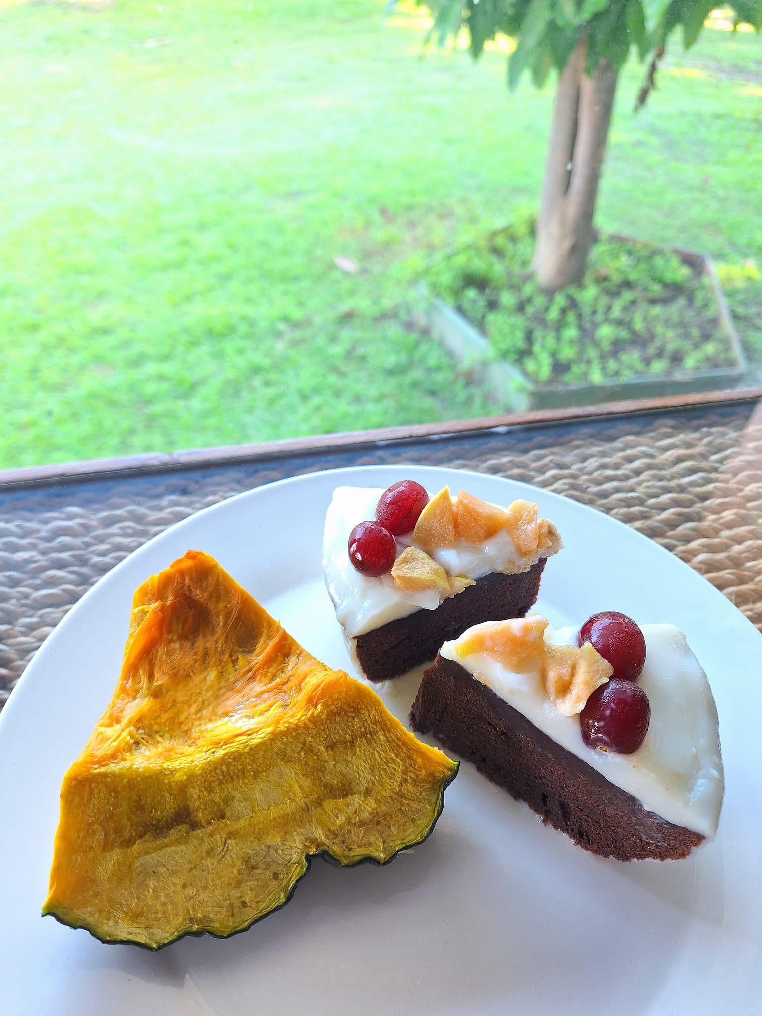 เช้านี้ จขกท. ขอนำเสนอเค้กช็อคโกแลต ฝักทองนึ่ง ลูกละมุด ก่อนไปทำงาน