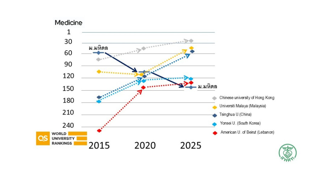 ผลการจัดอันดับของคณะแพทยศาสตร์ของไทยทุกคณะได้รับการจัดอันดับลดลงต่อเนื่องทุกปี ยกตัวอย่างเช่น คณะแพทยศาสตร์ ม.มหิดล ได้รับอันดับที่ 62 จาก 399 อันดับ ในปี พ.ศ. 2558, อันดับที่ 110 จาก 600 อันดับ ในปี พ.ศ. 2563 และ อันดับที่ 148 ในปี พ.ศ. 2568