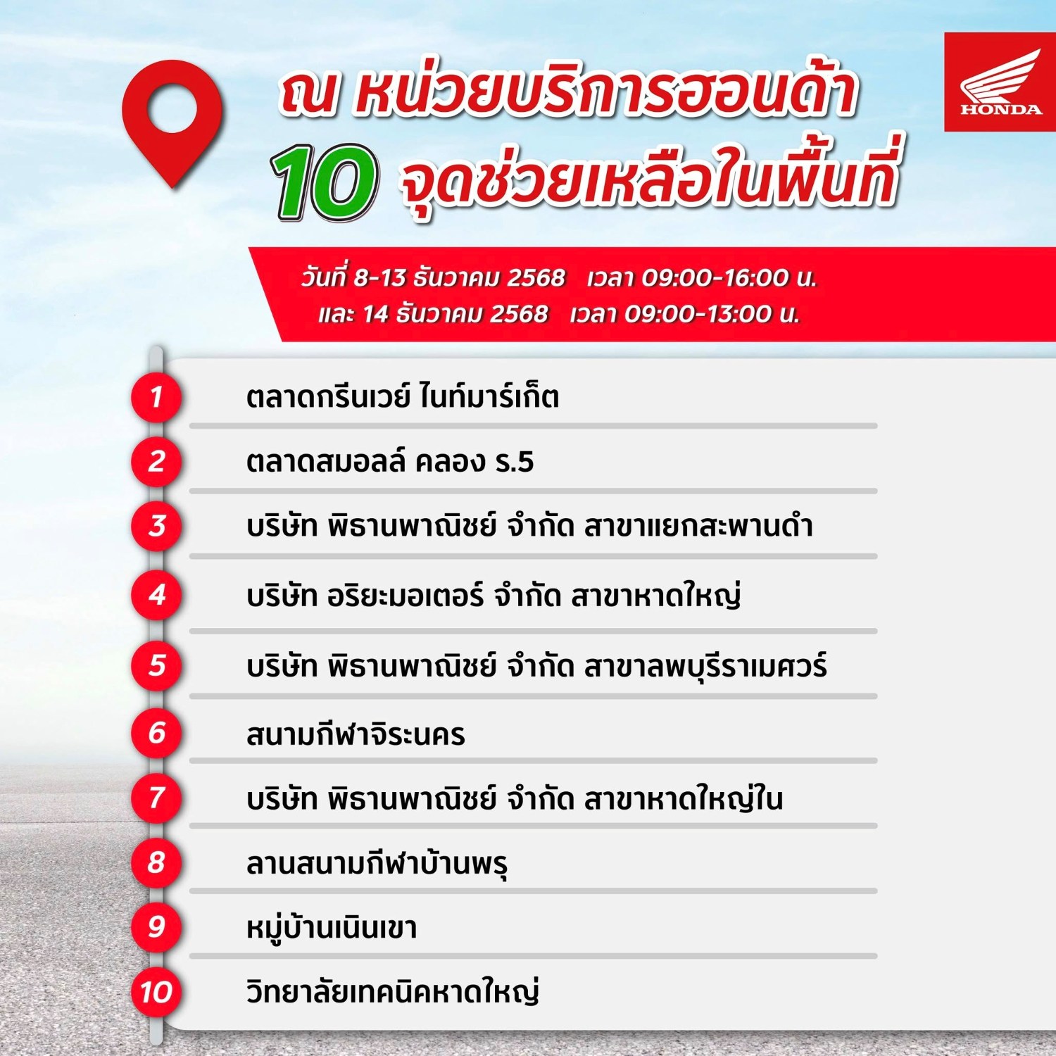 นอกจากจุดตั้งบริการฯ แล้ว ผู้ที่ได้รับผลกระทบสามารถเข้าบริการตรวจเช็กรถฟรี 10 รายการ (ตามคู่มือมาตรฐาน) ณ เครือข่ายร้านผู้จำหน่ายที่เข้าร่วมโครงการ ครอบคลุมทั้ง Honda Wing Center, ศูนย์บริการ Honda BigWing และ ร้าน CUB House ใน 10 จังหวัดภาคใต้ที่ได้รับผลกระทบ เปิดให้บริการตั้งแต่วันที่ 24 พฤศจิกายน – 31 ธันวาคม 2568 ณ เครือข่ายผู้จำหน่ายที่เข้าร่วมในแต่ละพื้นที่ (ดูสาขาที่ร่วมรายการได้ที่ : Facebook)