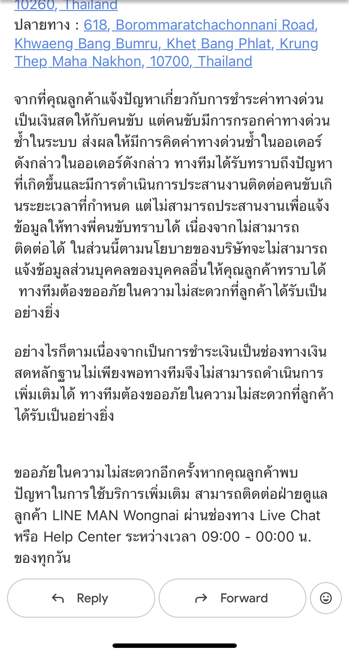 ให้เรารอ2-3วันก็ส่งอีเมลมาแบบไร้ความรับผิดขอบ ว่าติดต่อคนขับไม่ได้ ลองคิดดูถ้าไลน์แมนให้คนขับ ทำแบบนี้เรื่อยๆผู้โดยสารจะโดนโกงอีกเท่าไร