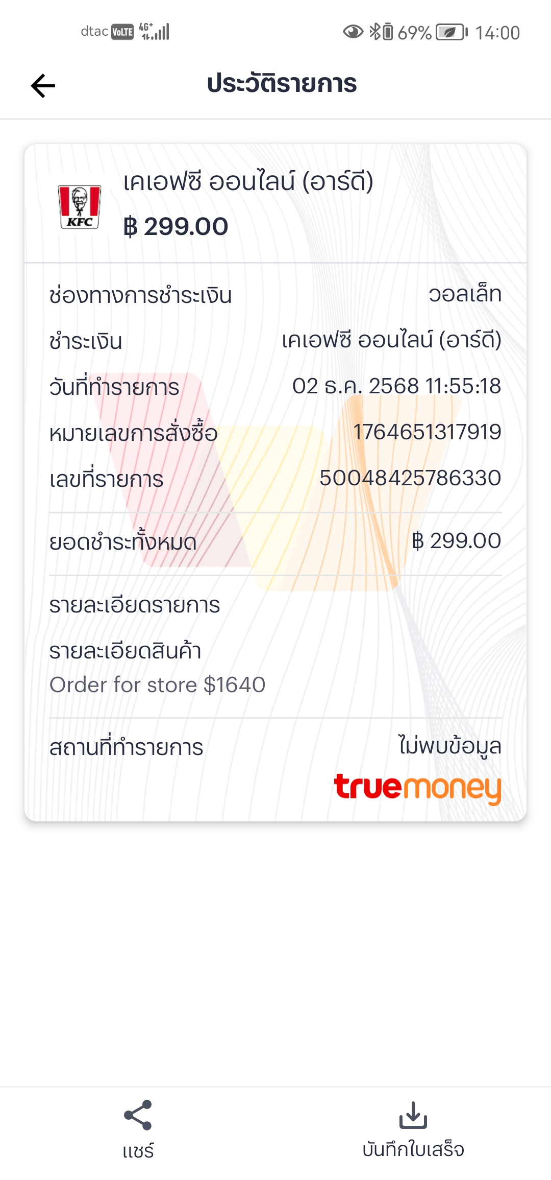 ผมสั่งKfcออนไลน์ สาขาโลตัสแห่งหนึ่ง แล้วไปรับสรุปพนักงานบอกไม่มีคำสั่งซื้อ จ่ายเงินล่วงหน้า