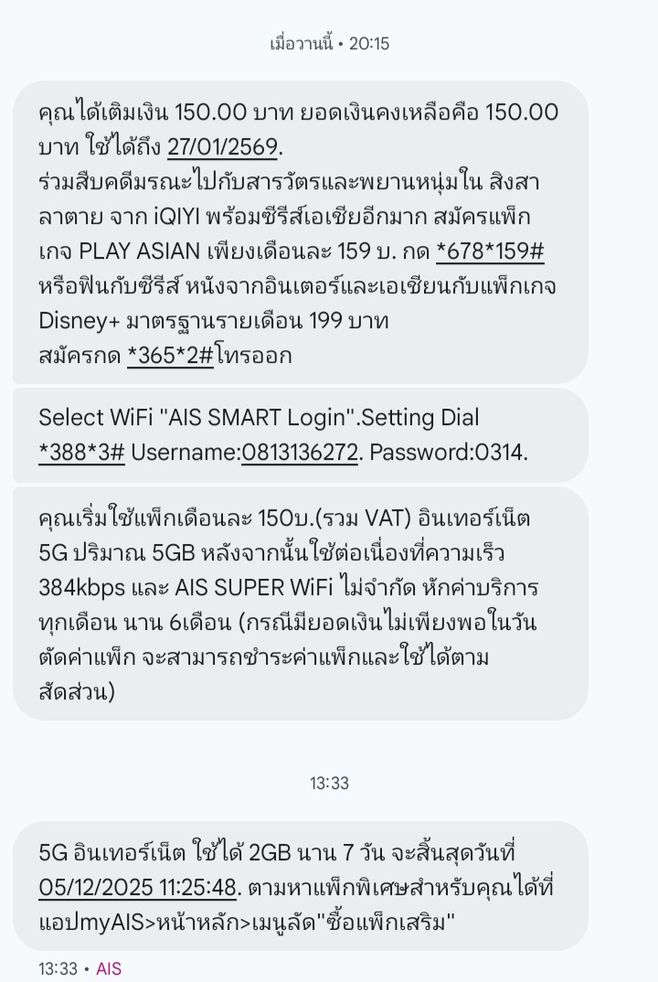 เติมเงินเข้าเบอร์ Ais เป็นรายเดือนแต่ไม่มีsmsแจ้งขึ้นมาเลย