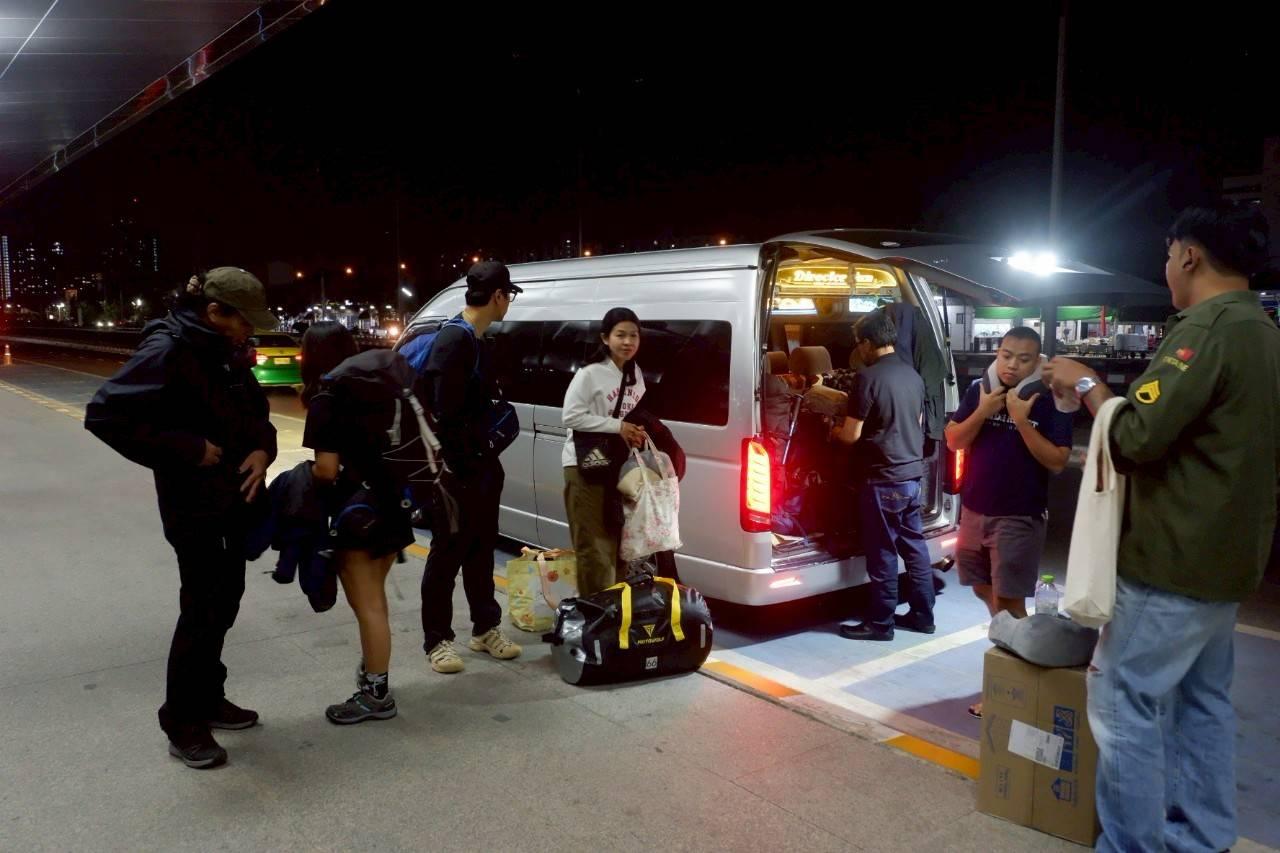 18.00 น. เรากับพี่ใหม่ 2 คน ออกเดินทางด้วยรถตู้เช่าเหมาคัน เริ่มต้นทางจากราชบุรี แวะรับจ๊ะโอ๋คนที่ 3 และเพื่อน ๆ คนอื่น ๆ อีก 5 คน รวมเป็น 8 คน ที่สถานีกลางกรุงเทพอภิวัฒน์ จุดนัดหมายคือประตู 8