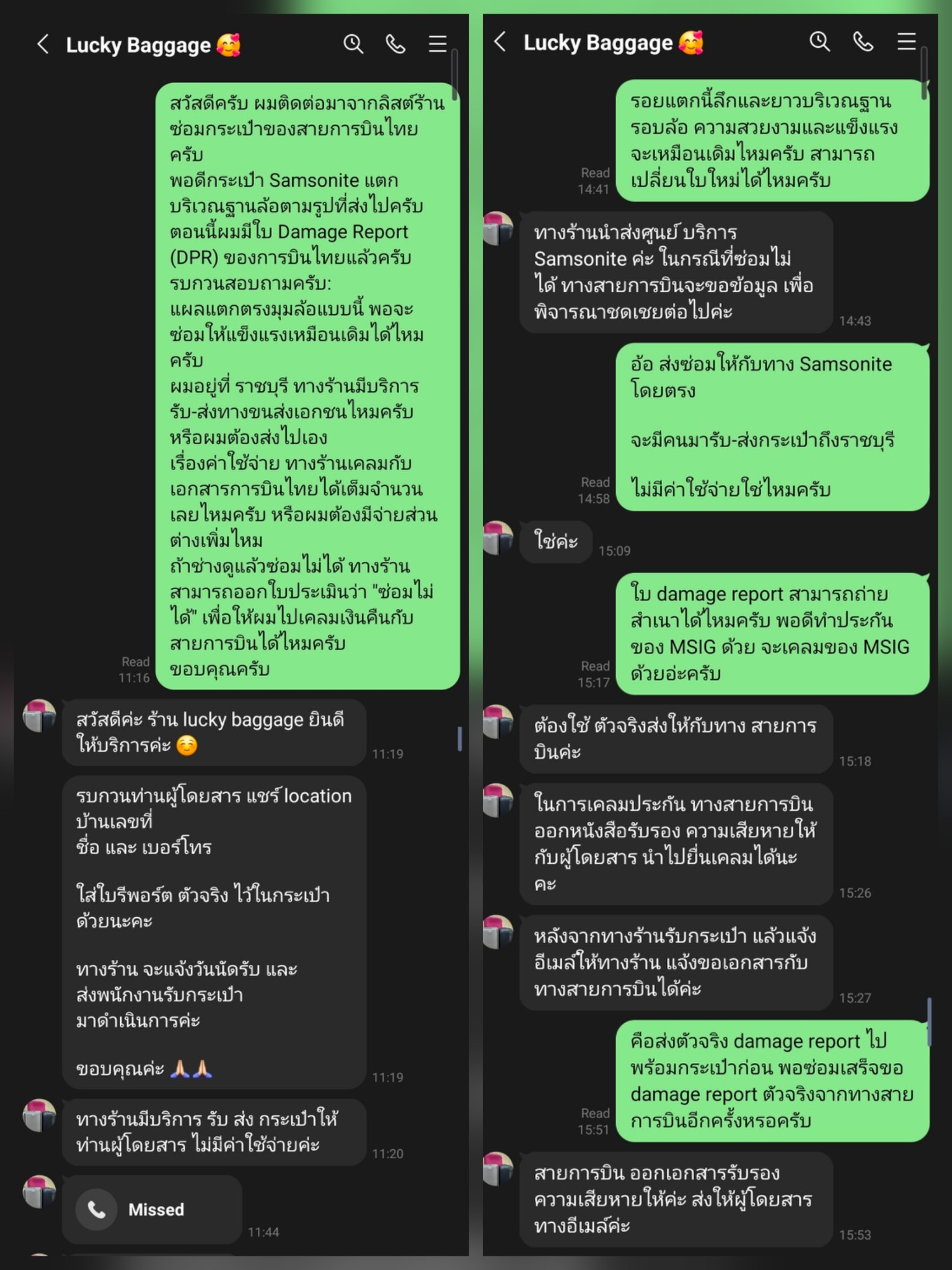 5. ร้านมีบริการรับ-ส่งถึงที่ และส่งเข้าศูนย์ Samsonite โดยตรง (ถ้าซ่อมไม่ได้ สายการบินพิจารณาชดเชย)