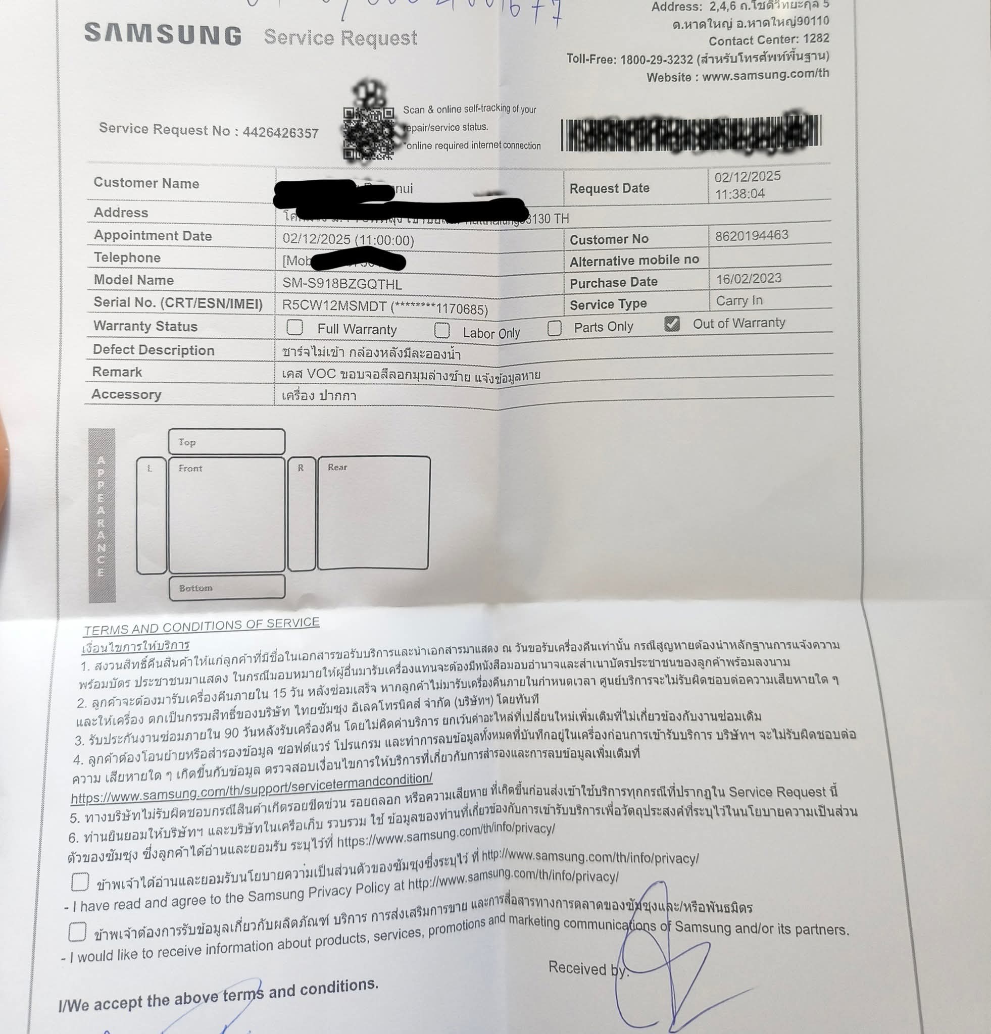 ประสบการณ์ที่เลวร้ายกับโทรศัพท์ Samsung S23 Ultra ใช้งานประมาณ 1 ปี กว่าฝาหลัง กาวเสื่อม (หมดประกัน Care+)