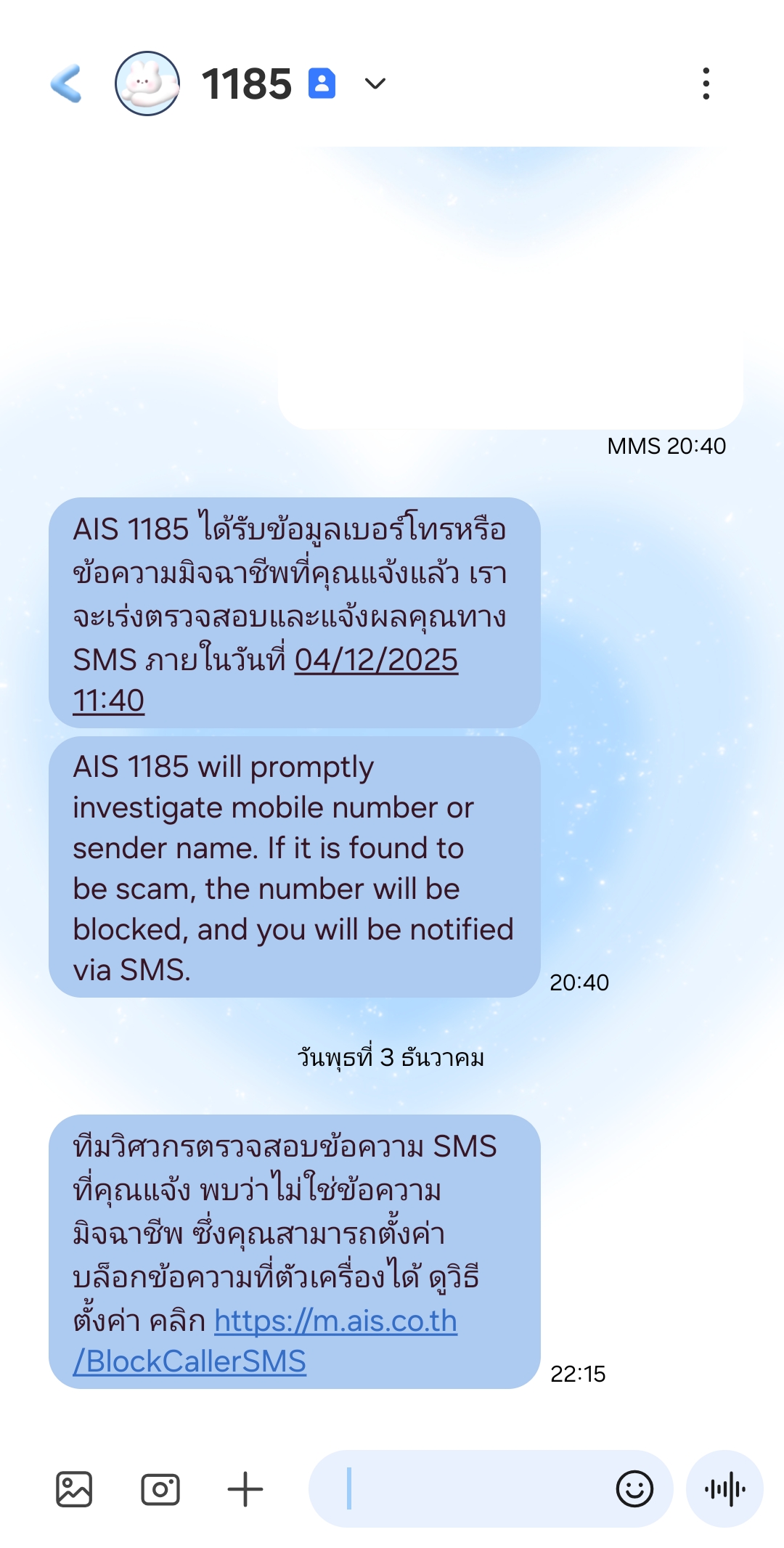 เราได้รับsmsเข้ามาในเบอร์ที่พึ่งเปิดใช้งาน ยังไม่ได้ให้เบอร์นี้กับใคร ยังไม่เคยใช่เบอร์นี้ที่ไหนเลย แล้วอยู่ๆมีข้อความส่งเข้ามา ดูยังไงก็ข้อความจากมิจฉาชีพ เลยส่งเข้าไปที่หมายเลข 1185 แล้วได้ข้อความตอบกลับมาว่าไม่ใช่ข้อความจากมิจฉาชีพ