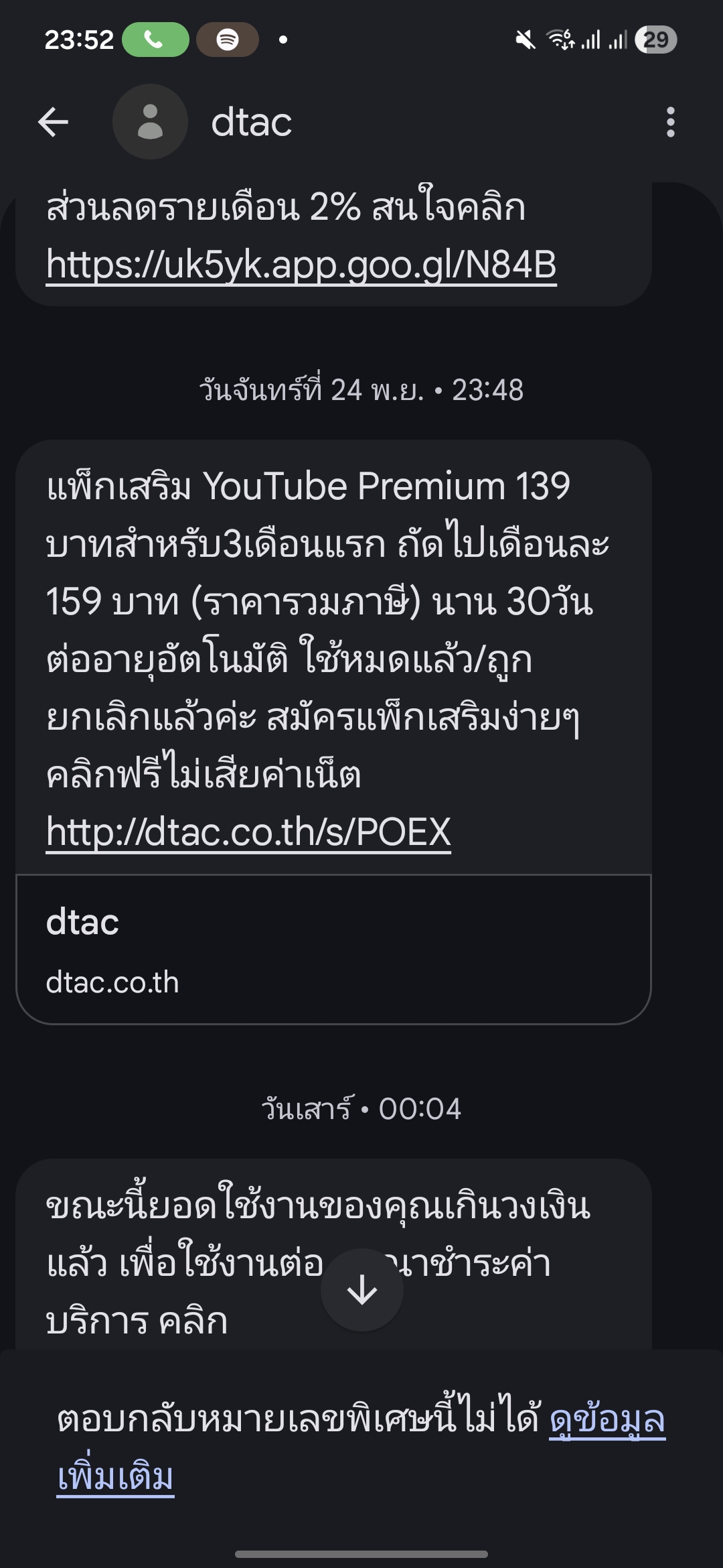 ผมสมัครยูทูปพรีเมี่ยของดีแทคแล้มผมยกเลิกไปเดือนพย.แต่กลับต้องมาจ่ายอีกเดือนธค.ยูทูปก็ใช้ไม่ได้แล้วคือยังไงคับ