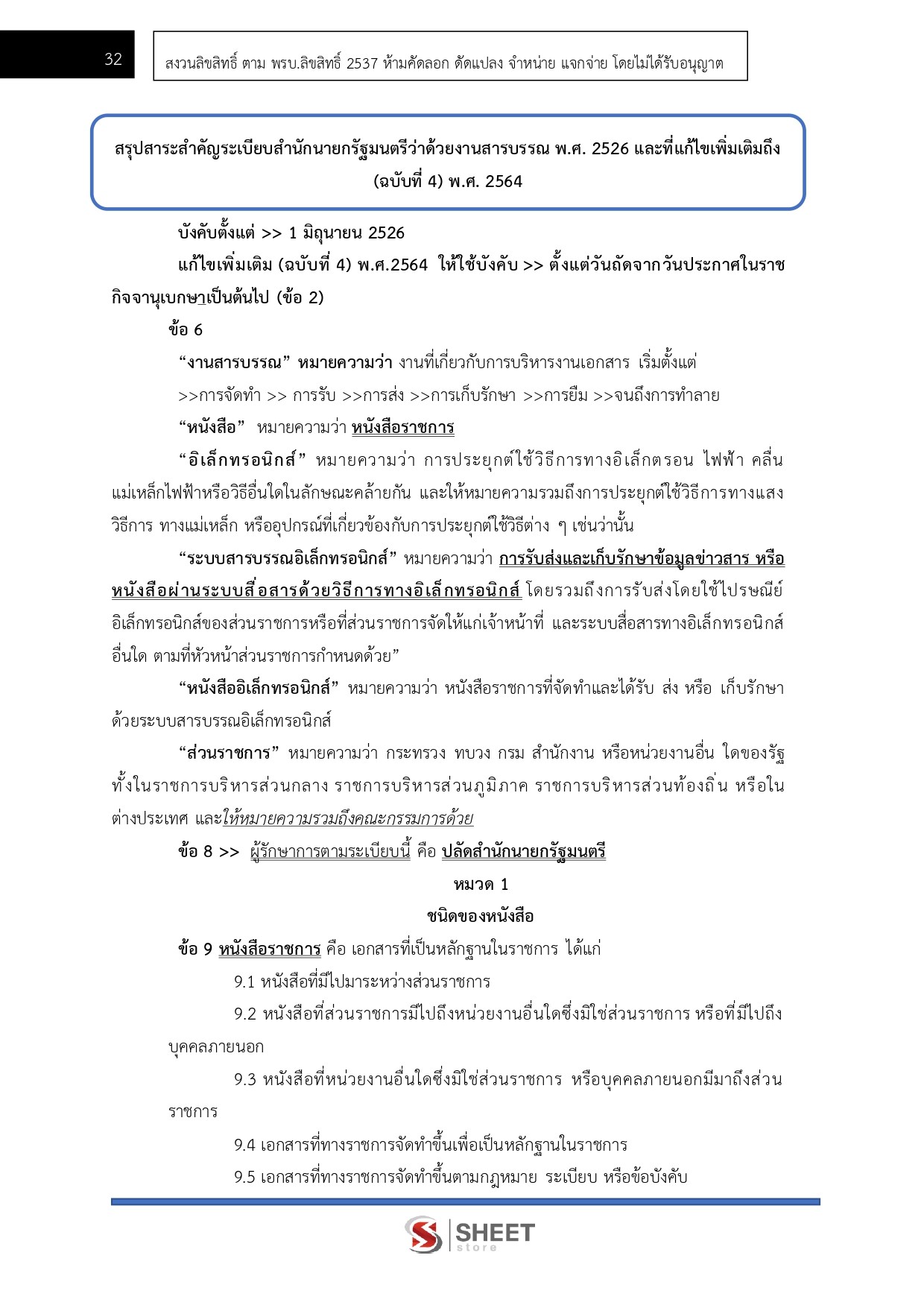 – แนวข้อสอบสรุปสาระสำคัญระเบียบสำนักนายกรัฐมนตรีว่าด้วยงานสารบรรณ พ.ศ. 2526 และแก้ไขเพิ่มเติมถึง (ฉบับที่ 4) พ.ศ. 2564