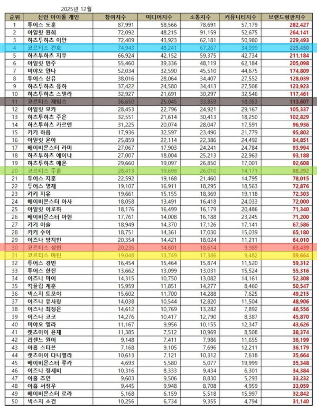 1. CORTIS' Keonho 2. ILLIT' Wonhee 3. Hearts2Hearts' Ian 4. ILLIT' Minju 5. CORTIS' Juhoon 6. KiiiKiii' Jiyu 7. Hearts2Hearts' Jiwoo 8. KiiiKiii' Leesol 9. MEOVV' Anna 10. CORTIS' Martin 11. ILLIT' Mo
