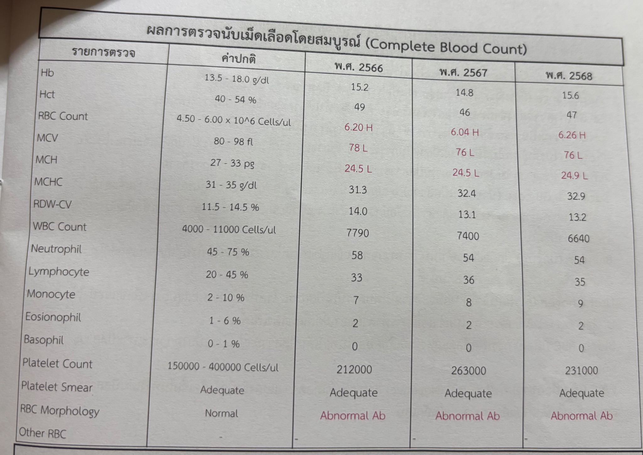 พอดีเดือนตุลาคมที่ผ่านมาผมได้ตรวจสุพภาพประจำปีที่ทำงาน ตอนปีแรกๆก็ไม่ได้สนใจผลตรวจ แทบไม่ได้ดูด้วยซ้ำ แต่ปีนี้มาดูกลับมีผลเลือดที่ไม่ดีมาตั้ง 3 ปีแล้ทำงานเข้าขของผมเข้ากะ 2 อาทิตย์เปลี่ยนทีครับ) ก่อนหน้านี้ตอนเรียนมัธยมก็เคยมีคุณหมอที่อยู่อนามัยให้ยาเม็ดสีเลือดหมูมากินอยู่แต่ผมไม่ได้กินตอนนั้น กลับมาปัจจุบันผมอยากทราบว่าผลเลือดแบบนี้หมายความว่ายังไงครับ พยายามหาข้อมูลเบื้องต้นแล้วไม่ค่อยเข้าใจ เม็ดเลือดแดงสูงกว่าปกติ แต่ค่า mcv กับ mch ต่ำกว่าปกติ