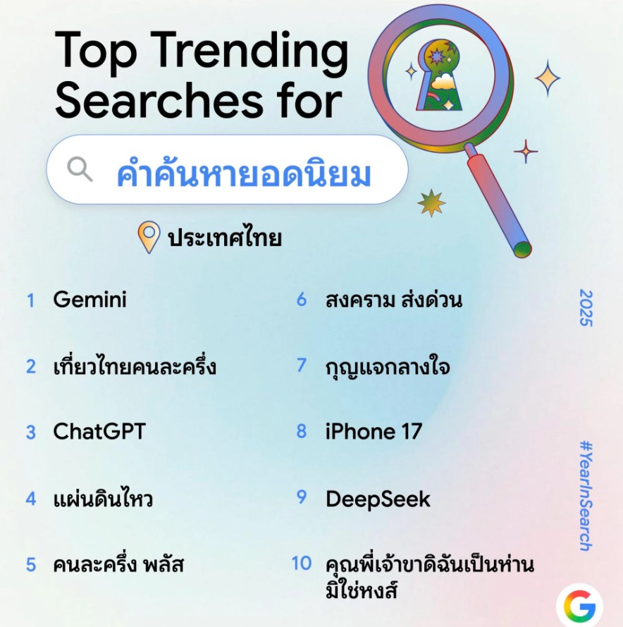 Google ประเทศไทย เปิดเผย ผลการค้นหายอดนิยมปีนี้สะท้อนให้เห็นถึงการผสานกันของเทรนด์เทคโนโลยี เหตุการณ์สังคม และความบันเทิงที่ต่างมีบทบาทสำคัญในการขับเคลื่อนความสนใจของคนไทยตลอดทั้งปี โดยเฉพาะด้านเทคโนโลยีซึ่งยังคงโดดเด่นที่สุดในปีนี้ โดย “Gemini” ครองอันดับ 1 คำค้นหายอดนิยมประจำปี 2568 นอกจากนี้ “ChatGPT” และ “DeepSeek” ก็ติดโผ 10 อันดับแรกเช่นเดียวกัน ในด้านนโยบายภาครัฐที่เกี่ยวข้องกับไลฟ์สไตล์และความเป็นอยู่ของประชาชนอย่าง “เที่ยวไทยคนละครึ่ง” และ “คนละครึ่ง พลัส” ยังคงได้รับความสนใจอย่างต่อเนื่อง