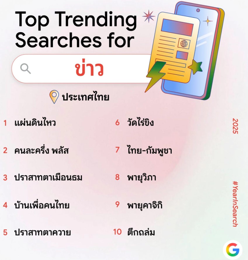 Google ประเทศไทย เผยผล “Year in Search 2025” รายงานสรุปคำค้นหายอดนิยมประจำปี 68 ที่สะท้อนภาพรวมความสนใจของคนไทยตลอดปี 68