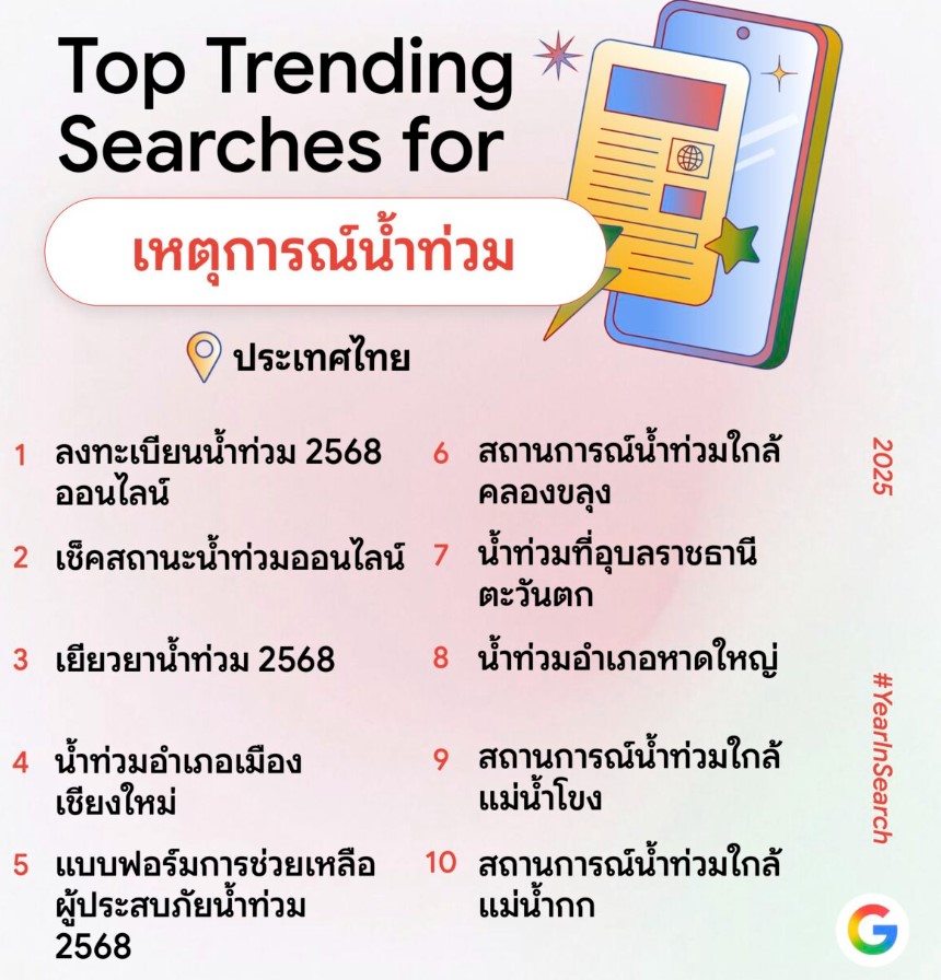 ความกังวลของคนไทยต่อสถานการณ์น้ำท่วมในหลายพื้นที่ของประเทศ ซึ่งส่งผลต่อชีวิตประจำวันทั้งการเดินทาง และความปลอดภัยสะท้อนผลอย่างชัดเจน โดย “ลงทะเบียนน้ำท่วม 2568 ออนไลน์” ครองอันดับ 1 คำค้นหายอดนิยมหมวดเหตุการณ์น้ำท่วม ตามด้วย “เช็คสถานะน้ำท่วมออนไลน์” “เยียวยาน้ำท่วม 2568” “น้ำท่วมอำเภอเมืองเชียงใหม่” “แบบฟอร์มการช่วยเหลือผู้ประสบภัยน้ำท่วม 2568” ในอันดับ 2- 5 ตามลำดับ และล่าสุด “น้ำท่วมอำเภอหาดใหญ่” ซึ่งเป็นเหตุการณ์ที่เกิดขึ้นได้ไม่นาน ก็พุ่งขึ้นมาติดโผใน 10 อันดับแรกอย่างรวดเร็ว