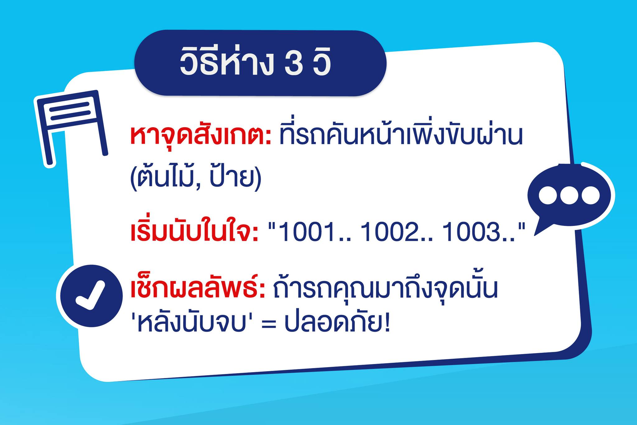 2. เมื่อรถคันหน้าเคลื่อนผ่านจุดนั้น ให้นับในใจ "1001…1002…1003" (หนึ่งพันหนึ่งนะ ไม่ต้อง 1-0-0-1