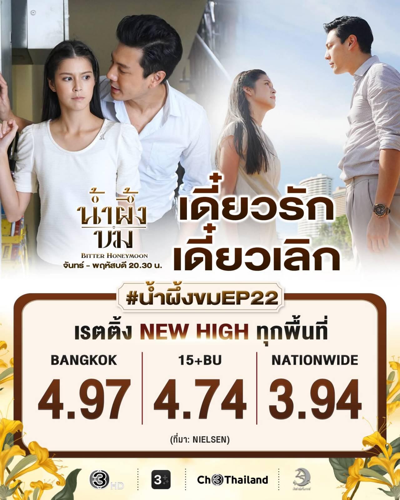 📌 เรตติ้งละคร "น้ำผึ้งขม" EP.22 เรตติ้งกรุงเทพฯ 4.97 เรตติ้ง 15+BU 4.74 เรตติ้งทั่วประเทศ 3.94 New High ทุกพื้นที่!! 🎉
