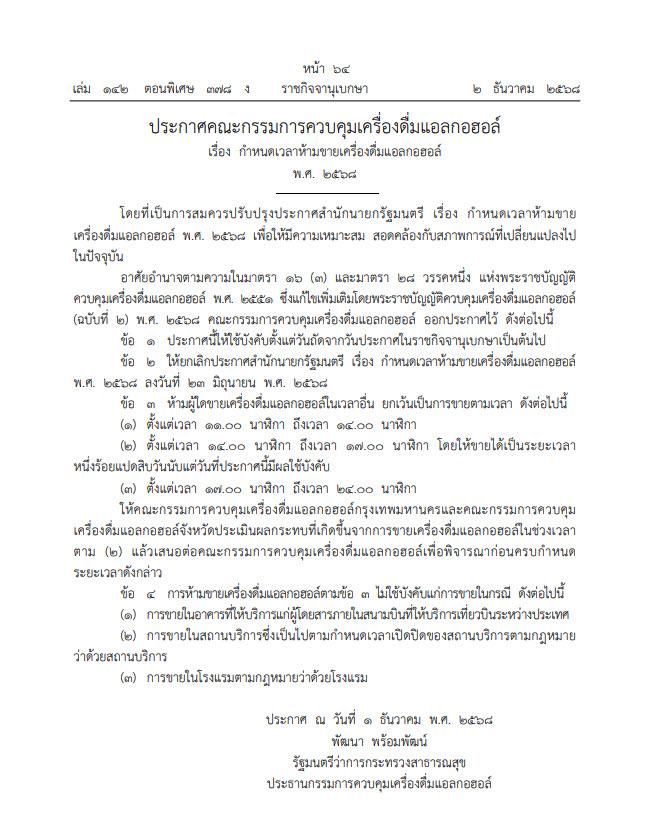 วันนี้ (3 ธ.ค.68) เว็บไซต์ราชกิจจานุเบกษา เผยแพร่ประกาศ คณะกรรมการควบคุมเครื่องดื่มแอลกอฮอล์ 2 ฉบับ ลงนามโดยนายพัฒนา พร้อมพัฒน์ รัฐมนตรีว่าการกระทรวงสาธารณสุข ในฐานะประธาน กรรมการควบคุมเครื่องดื่มแอลกอฮอล์ ซึ่งมีผลเปลี่ยนแปลงสำคัญต่อกรอบเวลาการจำหน่ายและบริโภคเครื่องดื่มแอลกอฮอล์ ประกาศฉบับแรก เรื่อง กำหนดเวลาห้ามขายเครื่องดื่มแอลกอฮอล์ พ.ศ. 2568 ให้มีผลบังคับใช้ตั้งแต่วันถัดจากวันประกาศ โดยให้ ยกเลิกประกาศสำนักนายกรัฐมนตรี ลงวันที่ 23 มิถุนายน 2568 และกำหนดช่วงเวลาจำหน่ายใหม่ดังนี้