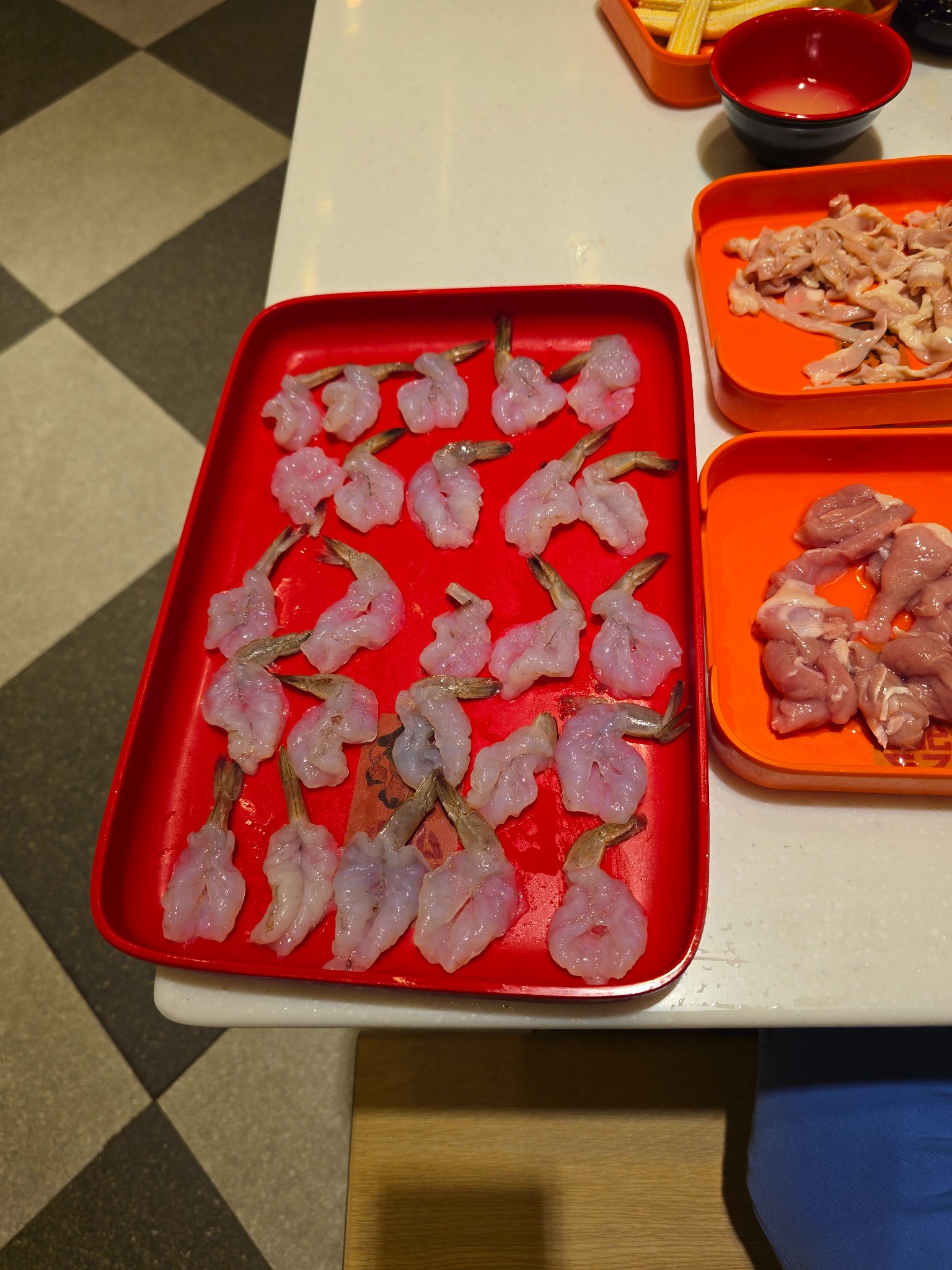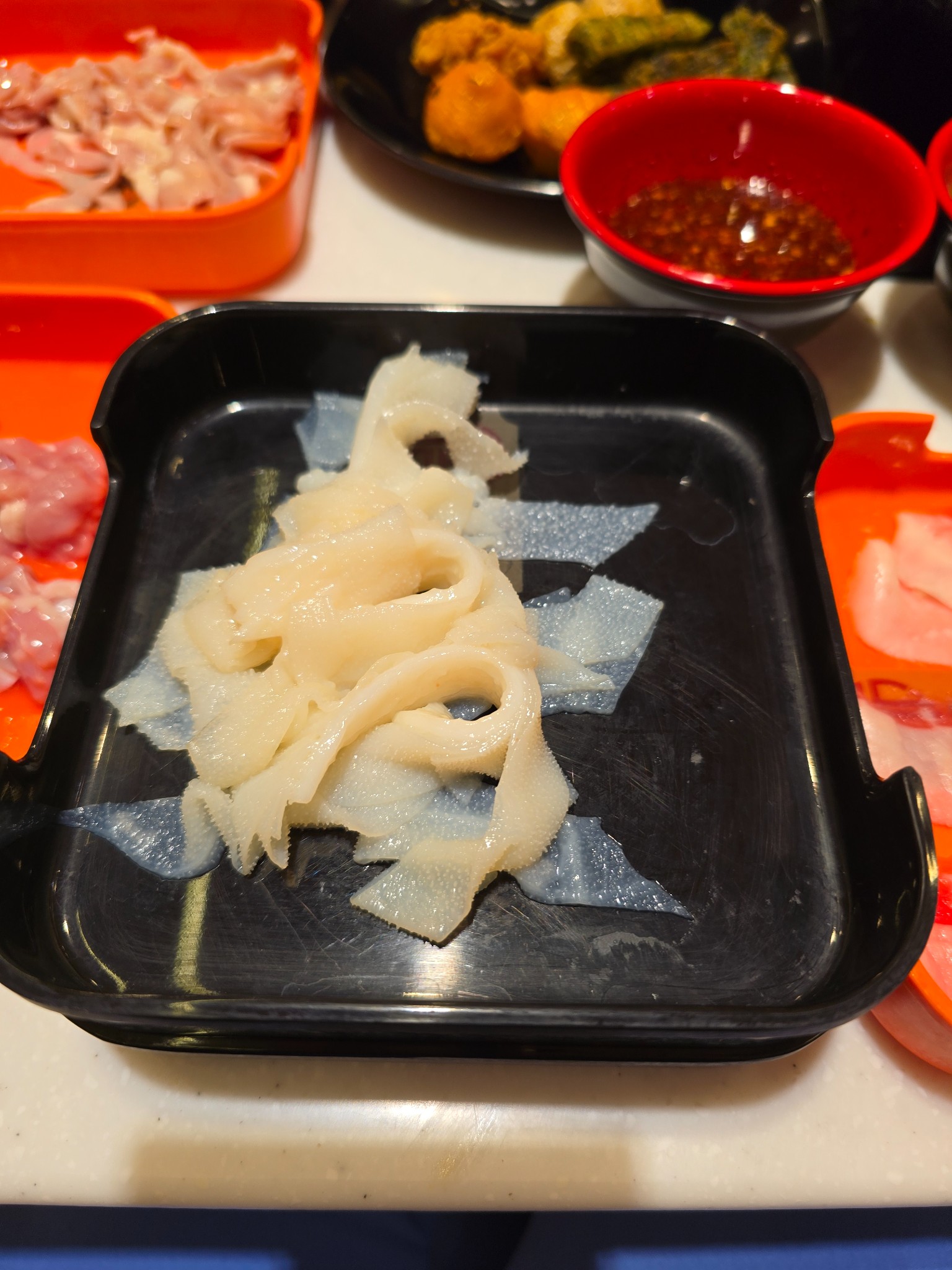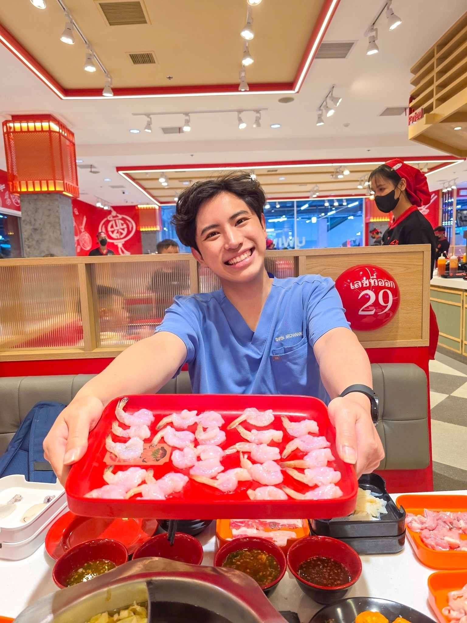 ⚠️ แต่มีเรื่องให้สะกิดใจนิดนึงครับ: ตอนเสิร์ฟมามีอยู่ถาดนึง (ถาดดำ ๆ) ที่รู้สึกว่ากุ้งมันดูแปลก ๆ... ดูตัวเล็กกว่าปกติและเนื้อจะเด้งกรอบ ไม่ใช่แบบนุ่ม ๆ เหมือนที่สั่งในรอบแรก ๆ ไม่แน่ใจว่าเขาเสิร์ฟผิดเป็นกุ้งแก้วธรรมดาหรือเปล่า? แต่ก็ด้วยความหิว (และอร่อยอยู่ดี) ก็เลยกินไปจนหมดครับ 😅 ถ้าใครเคยเจอแบบนี้ หรือพนักงานร้านผ่านมาช่วยตอบหน่อยได้ไหมครับว่ามันคือกุ้งอะไร?