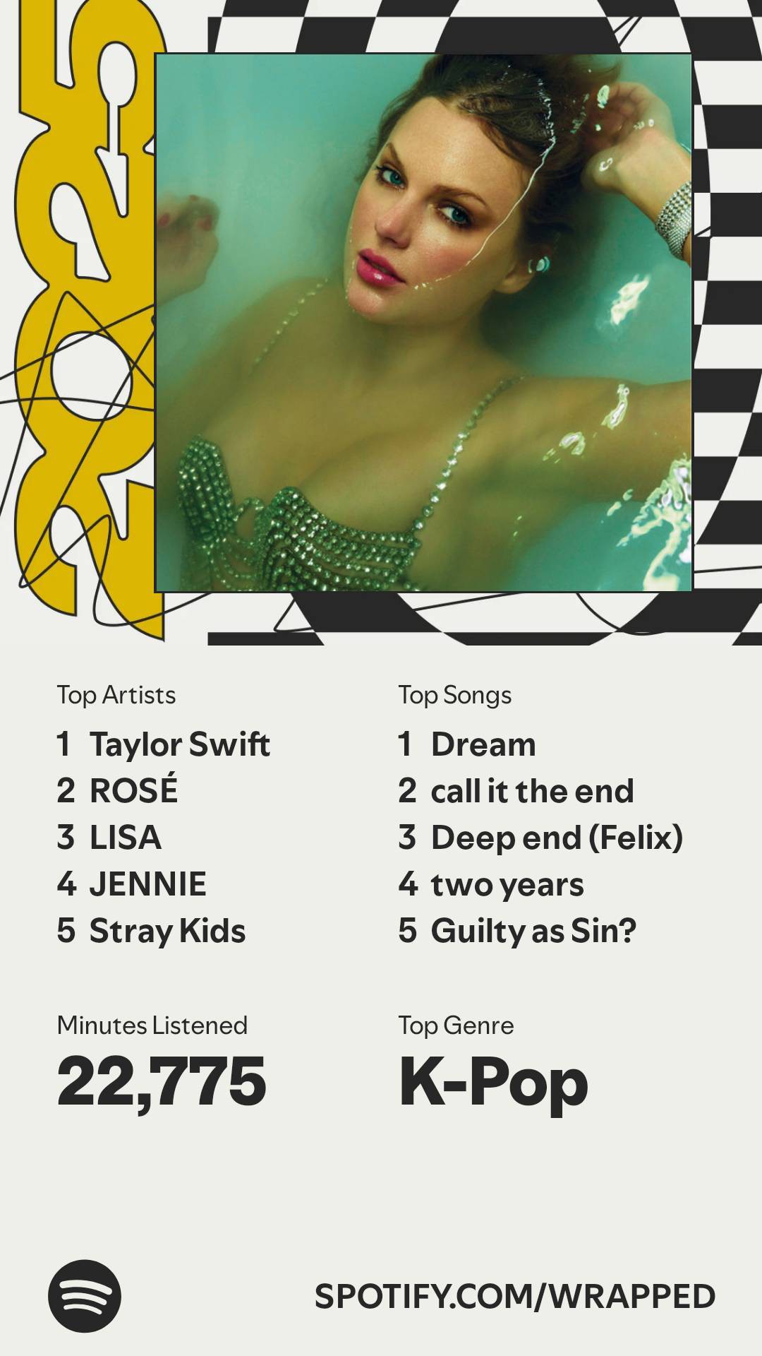 Top song เป็นอะไรที่ผิดคาดจริง ๆ ไม่คิดว่าตัวเองจะฟัง Dream ของ Lisa เยอะขนาดนี้ ตอนจิ้มคำตอบ quiz แน่นอนว่าเราเลือก Guilty as Sin เราคิดว่าเราฟังเพลงนี้บ่อยกว่า และไม่น่าเชื่อว่า Damn Right ของ Jennie ไม่ติด ฟังบ่อยจะตาย แต่ตัวเลขก็แปะมาว่าเราฟัง Dream ไปพันกว่าครั้ง (เยอะสุด ๆ)