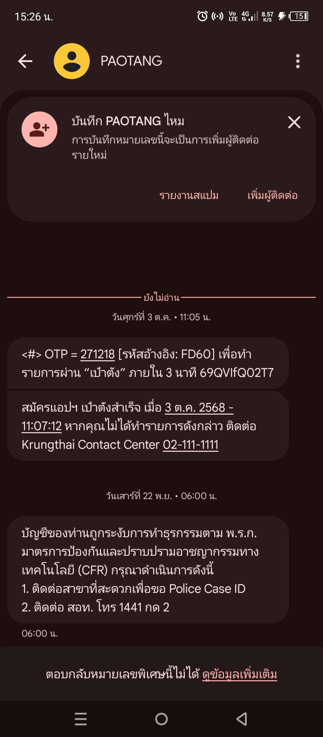 จนกระทั่ง เพื่อนของพี่เขา ให้ทำงานให้เขา ผมก็ไม่รู้อะไรมากเรื่องงาน เพราะผมก็ส่งของวัสถุก่อสร้าง พี่เขาให้ผมโอนเงินให้เขา เนื่องจากพี่เขาไม่มีบันชีไทยผมก็ไม่ได้คิดอะไร เพราะเขาบอกผมว่าเป็นเงินเพื่อน พอมาครั้งที่2 เขาให้ผมโอนเงินจำนวน2ครั้งยอด15,000กับยอด50,000ยอด15,000ผมโอนไปให้เขาแต่พอยอด50,000ผมโอนไม่ได้เพราะมันเกินวงเงินโอนรายวันผมก็จะไปกดและโอนทางตู้ให้เขาแต่ก็ไม่ได้กด เพราะบัตรผมโดนอายัด ผมก็บอกพี่เขาว่าทำไมโดนอายัด พี่เขาก็บอกว่าเพื่อนพี่ไม่ได้อายัดน่ะจะคุยกับเพื่อนพี่มั้ย ผมก็ขอคุย แต่พี่เขาก็บอกรอเพื่อนมาพี่เดะให้คุย ผมก็หาวิธีเอาเงินออก ผมก็คิดว่าบันชีมันโดนอายัดไปแล้วพี่เขาก็บอกไปธนาคารผมก็บอกไปว่าพี่ทำบันชีผมอายัดยังจะให้ผมไปธนาคารหรอผมก็มีลูกของผมน่ะทำไมต้องให้ผมรับผิดชอบทุกอย่าง ตอนนั้นหัวร้อนใส่เขา หลังจากนั้นพี่คนนั้นก็ติดต่อไม่ได้อีกเลยพอเวลาผ่านไปพี่ชายก็โอนเงินคืนผมที่เท่าที่พี่ชายยืมผม ผมก็บอกบันชีนั้นใช่ไม่ได้เพราะบันชีโดนอายัด พี่ชายก็บอกว่ามันโอนเขาได้น่ะถ้าอายัดมันโอนไม่ได้ผมก็โหลดแอพธนาคารใหม่และเข้าไปดูบันชีก็ใช้ปกติ มันเป็นเพราะบัตรธนาครที่โดนอายัดอย่างเดี๋ยว หลังจากนั้นผมก็ใช่เงิน50000เองเพราะว่าผมติดต่อพี่เขาไม่ได้และเขาบล็อคผมทิ้ง