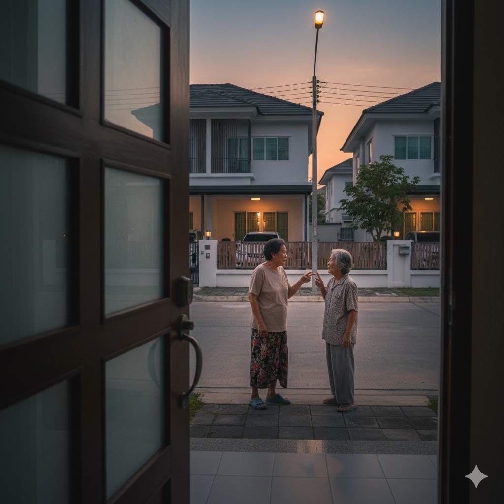 ตอนเย็นเดินออกไปเก็บพัสดุหน้าบ้าน ได้ยินป้าคุยกับคนข้าง ๆ แบบไม่ได้กดเสียงเบาเลยว่า: