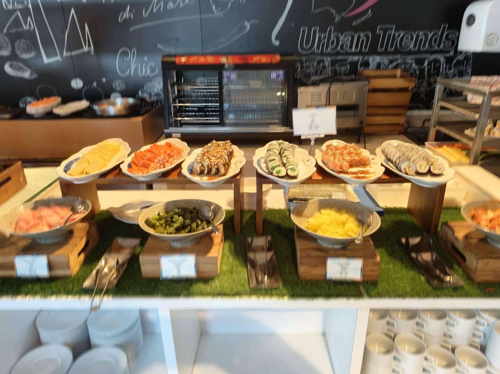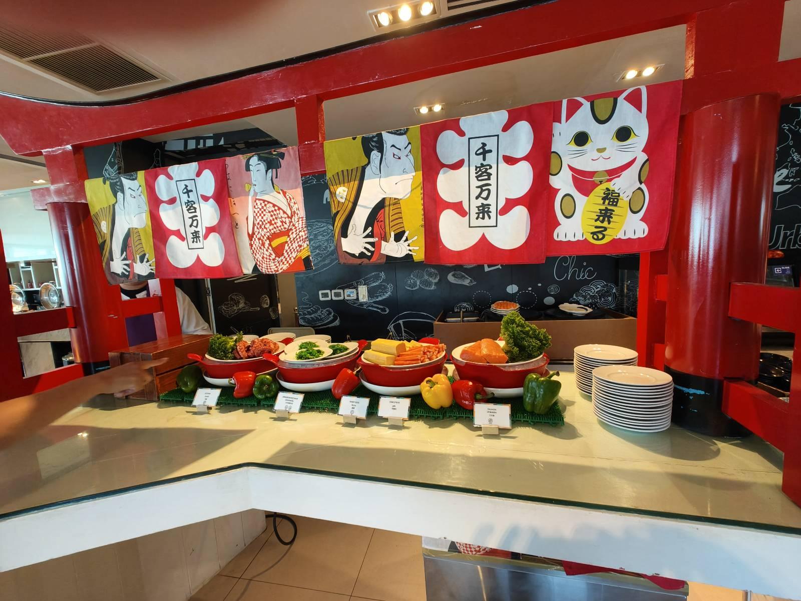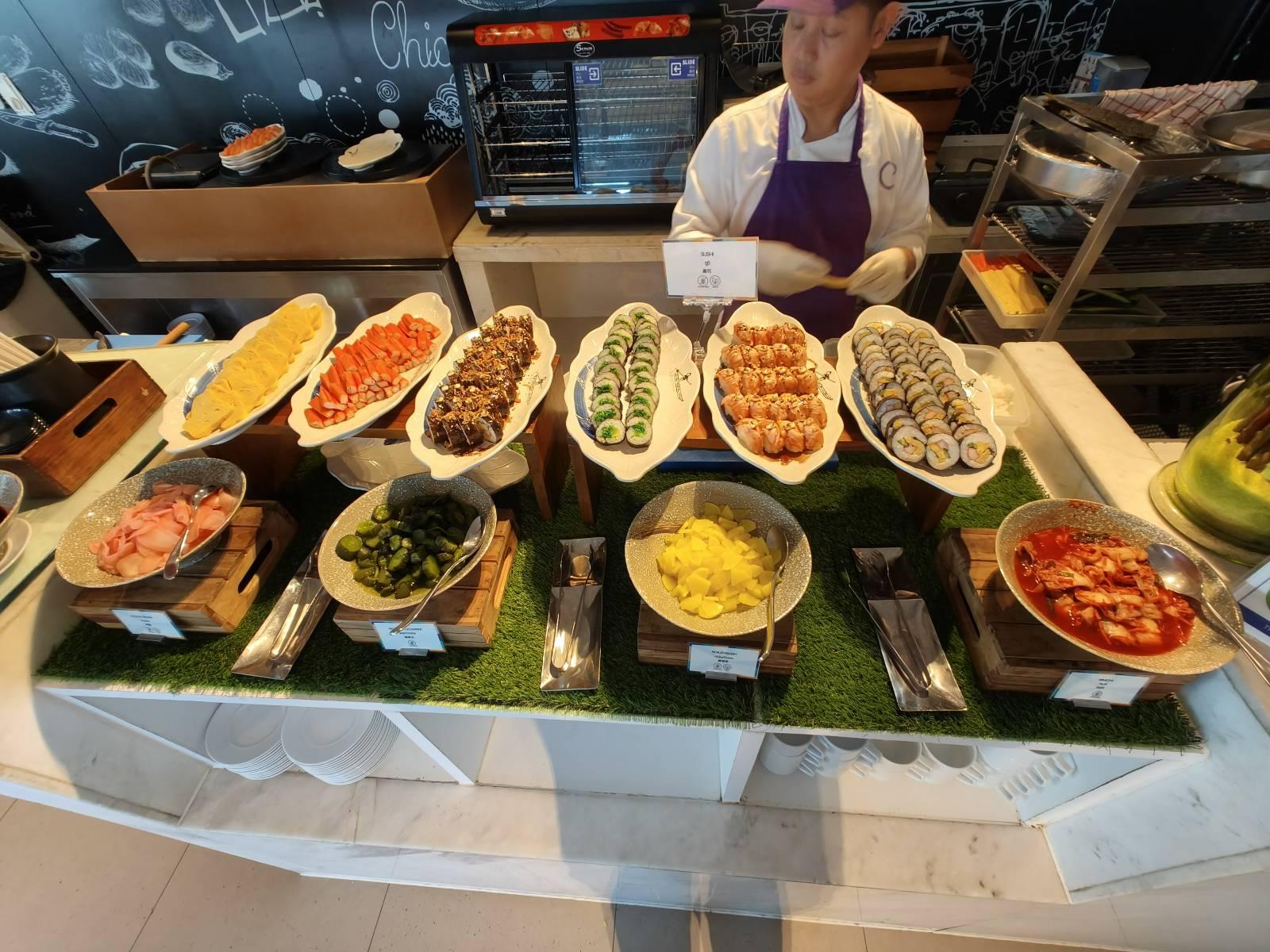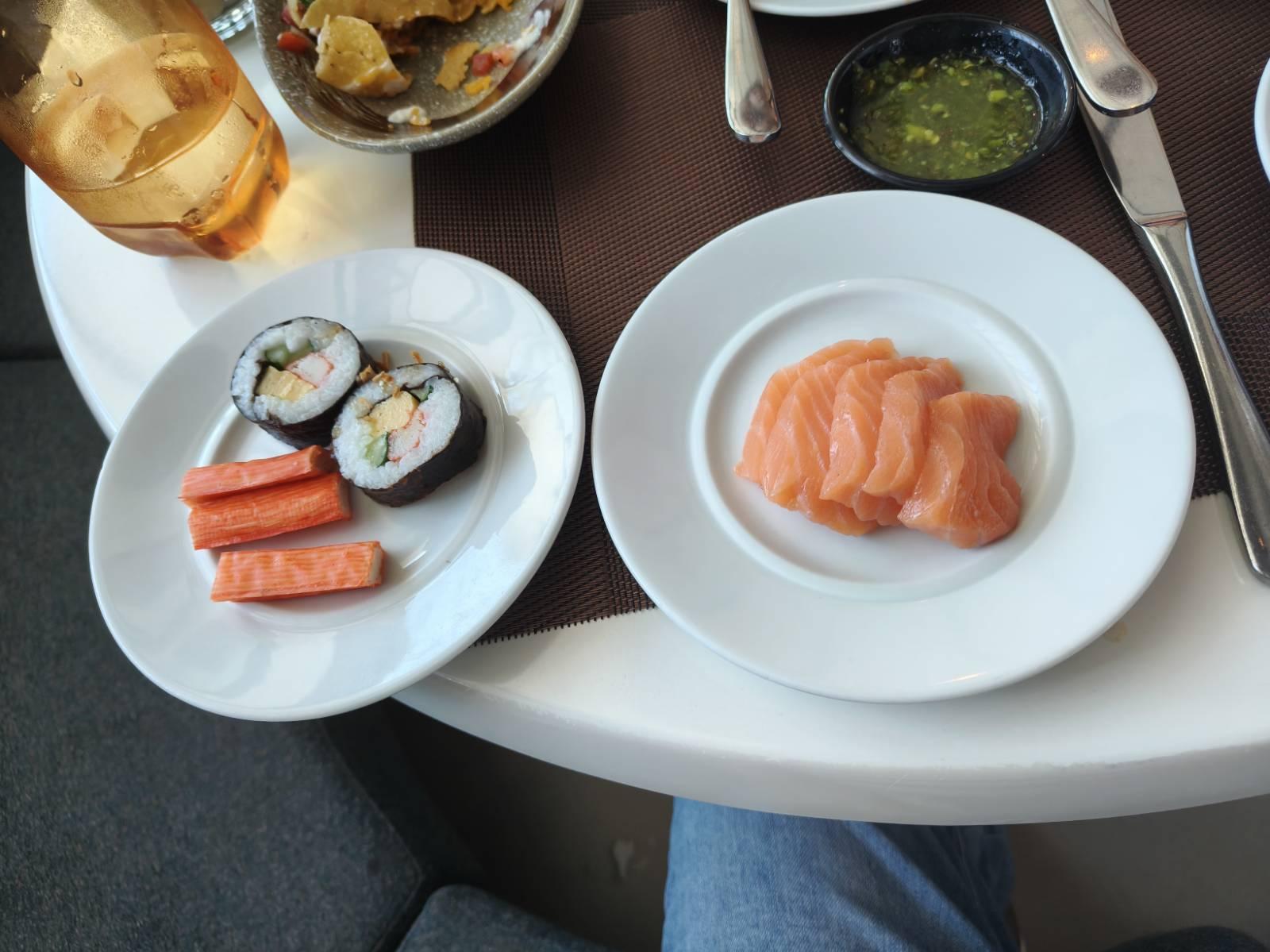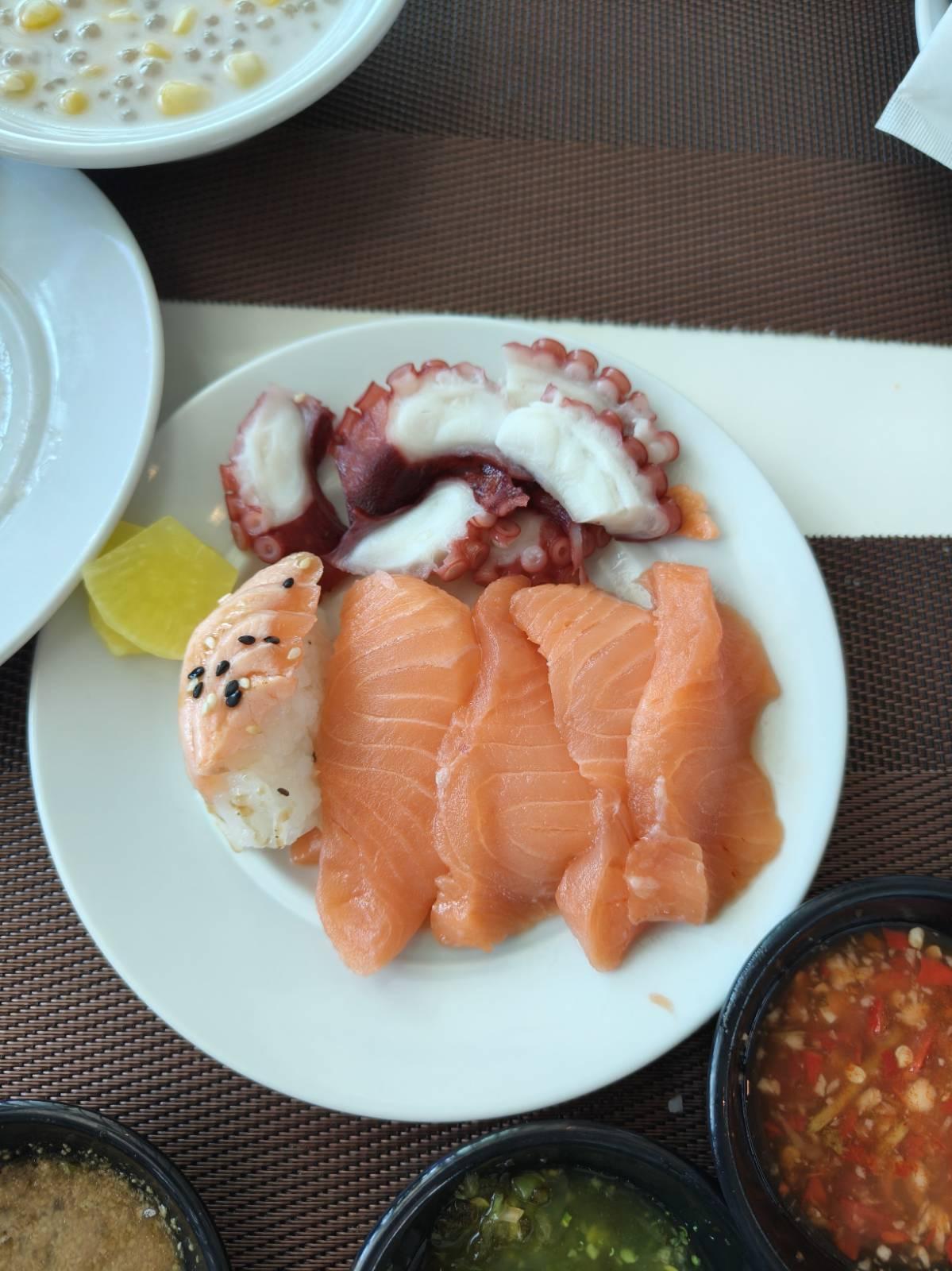 เข้าห้องอาหาร ด้านขวา เป็นไลน์อาหารญี่ปุ่น มีซาซิมิแซลมอน,ปูอัด,ปลาหมึก,ไข่หวาน,ยำสาหร่าย และมีซูชิโรลหลากหลายอยู่ด้านข้าง (โซนนี้ลุงชอบ เล็งไว้ก่อน แซลมอนเจอกันแน่)