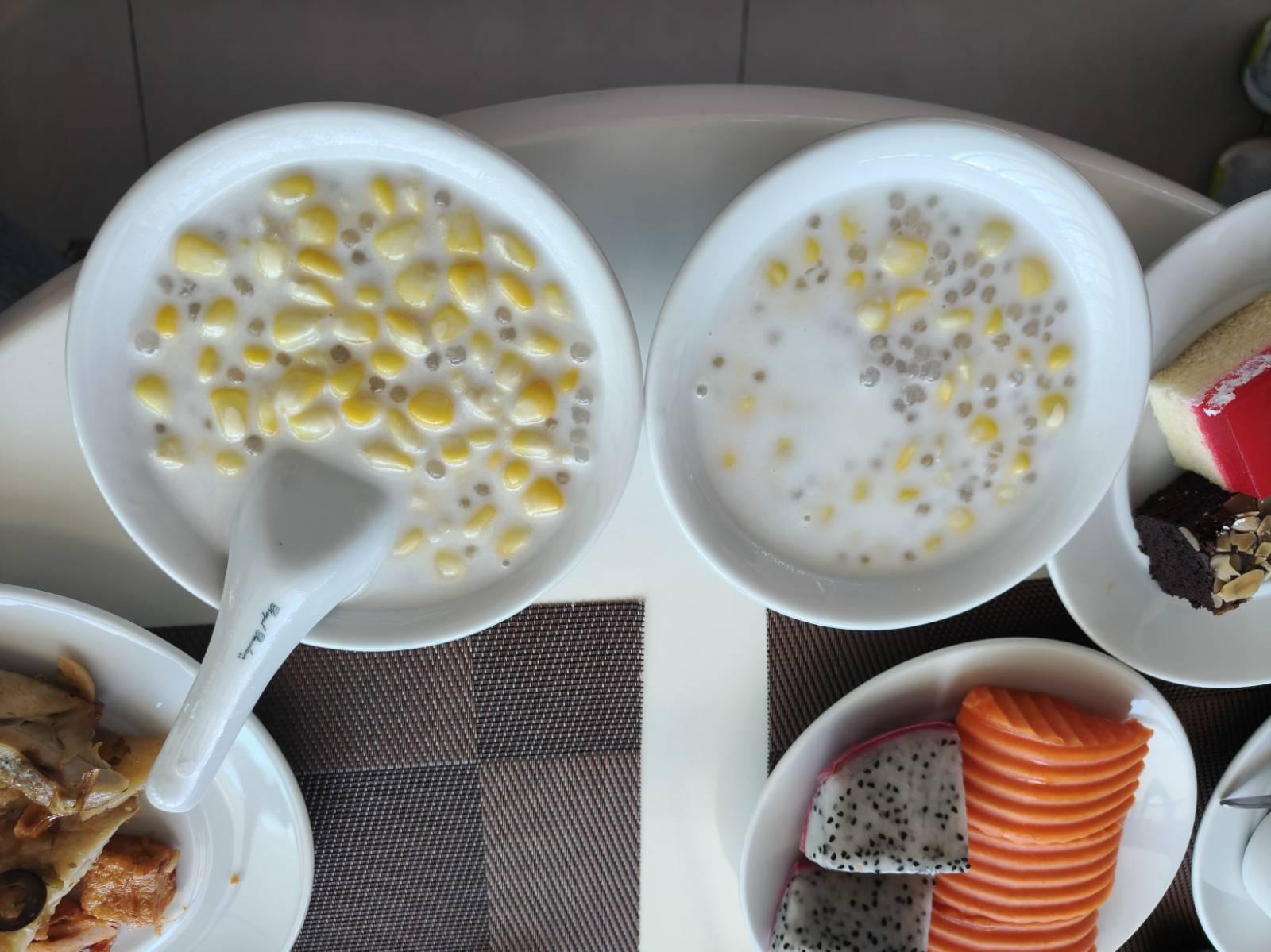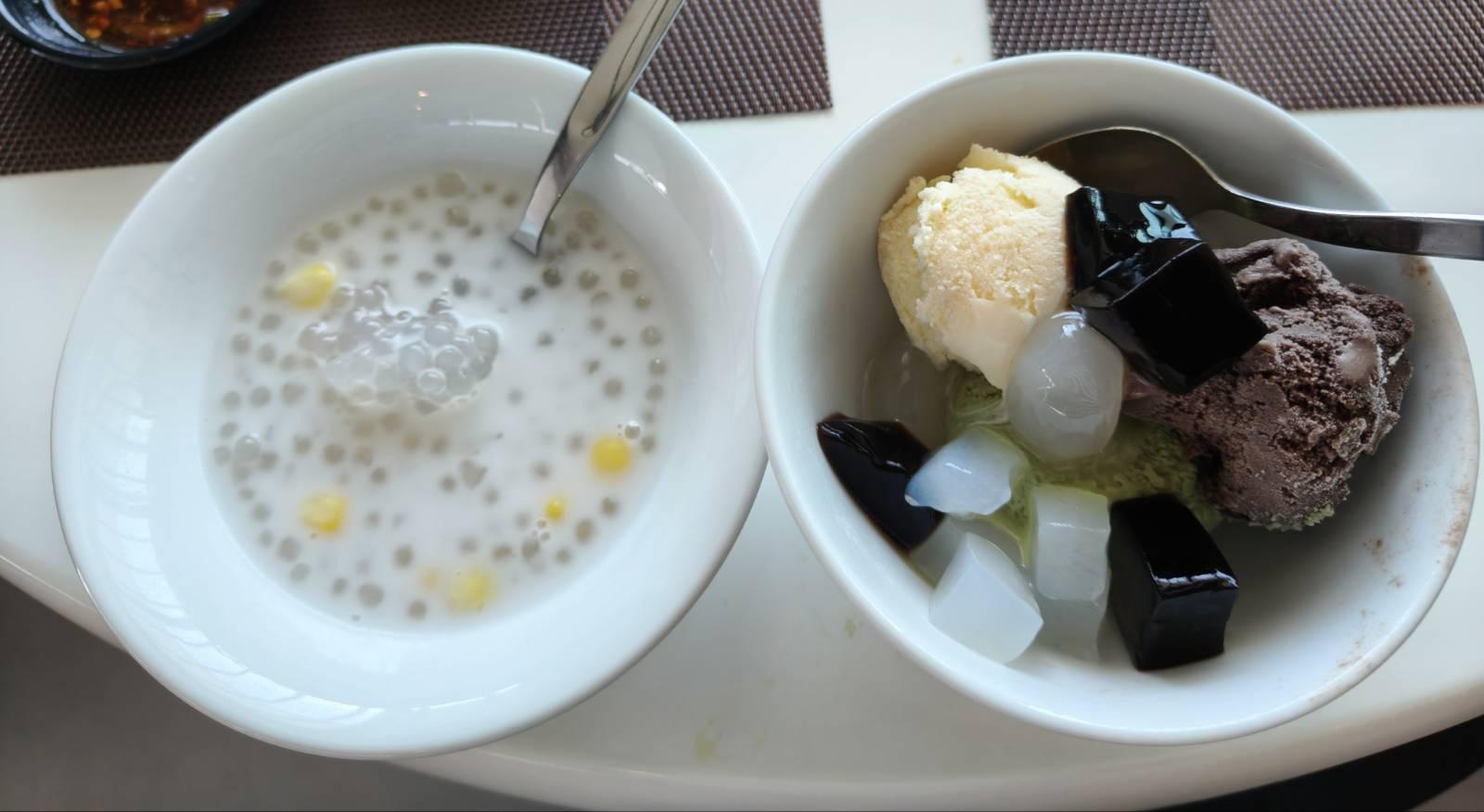 มาว่ากันที่ของหวานของโปรดป้า เป็น สาคูข้าวโพด ไม่หวาน ถูกใจป้าเลย  แต่ป้าบอกลุงว่าขาดมะพร้าวอ่อน ถ้ามีมะพร้าวอ่อนจะดีมาก นอกจากนั้นยังมีไอติมมี 3 รส วนิลา ช็อกโกแลต ชาเขียว เป็นของ I Scoop รสชาติได้ ไม่หวานมาก มีไอติมแล้ว ต้องมีเค้ก เป็นก้อนเล็กๆ เค้กแอปเปิ้ล เค้กวนิลา บราวนี่ ครีมบูเล่ เยลลี่ ผลไม้มี แก้วมังกร มะละกอ