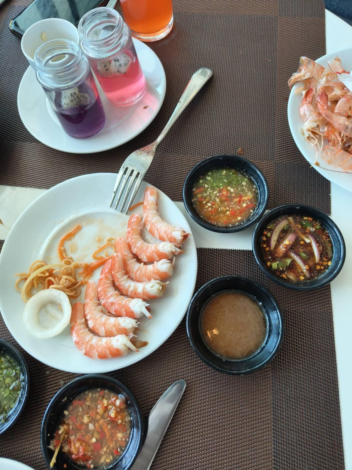 ส่วนน้ำจิ้มซีฟู้ด มี 2 สี เขียว กับ แดง รสชาติกลางๆ รสไม่จัด มีมะนาวเติมเปรี้ยวได้