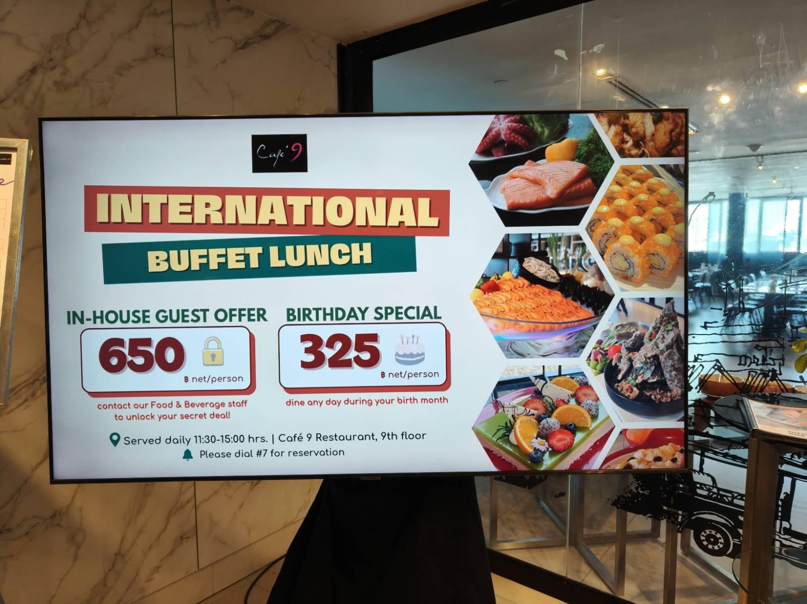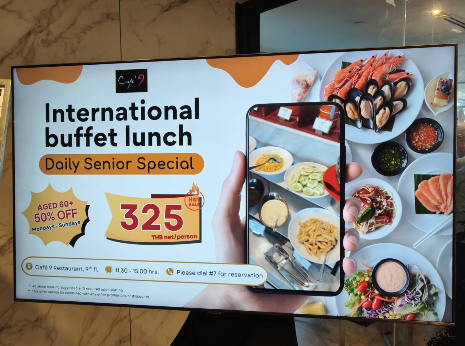 ลุงป้าเลื่อนฟีดในเฟสบุ๊ค เจอโปรโมชั่นสำหรับ สว. (สูงวัย) อายุ 60+ จะได้กินบุฟเฟ่ต์ครึ่งราคา ห้องอาหารนี้ คือ ห้องอาหาร คาเฟ่ 9 โรงแรมเซ็นทาราวอเตอร์เกท ชั้น 9 @centarawatergatebkk