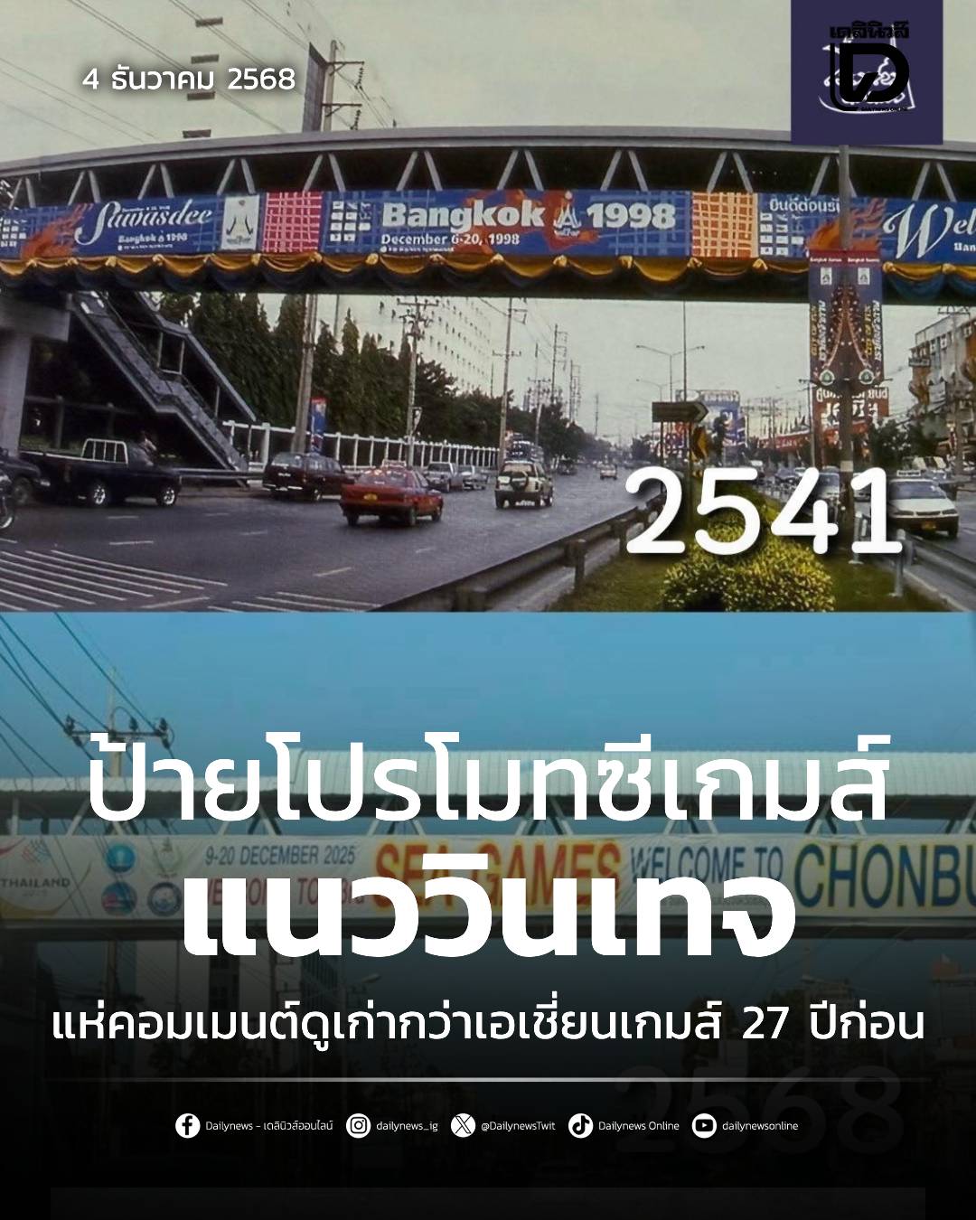 "ซีเกมส์ 2025" งานเข้าอีก เพจดังแฉภาพโปรโมตบนสะพานลอย ที่ชลบุรี เทียบกับ ป้ายโฆษณา "เอเชียนเกมส์ 1998" ปรากฏว่า ของเมื่อ 27 ปีที่แล้วยังดูทันสมัยกว่า จนคนคอมเมนต์กันสนุก นึกว่าป้ายโฆษณาย้อนยุคสไตล์ "วินเทจ"