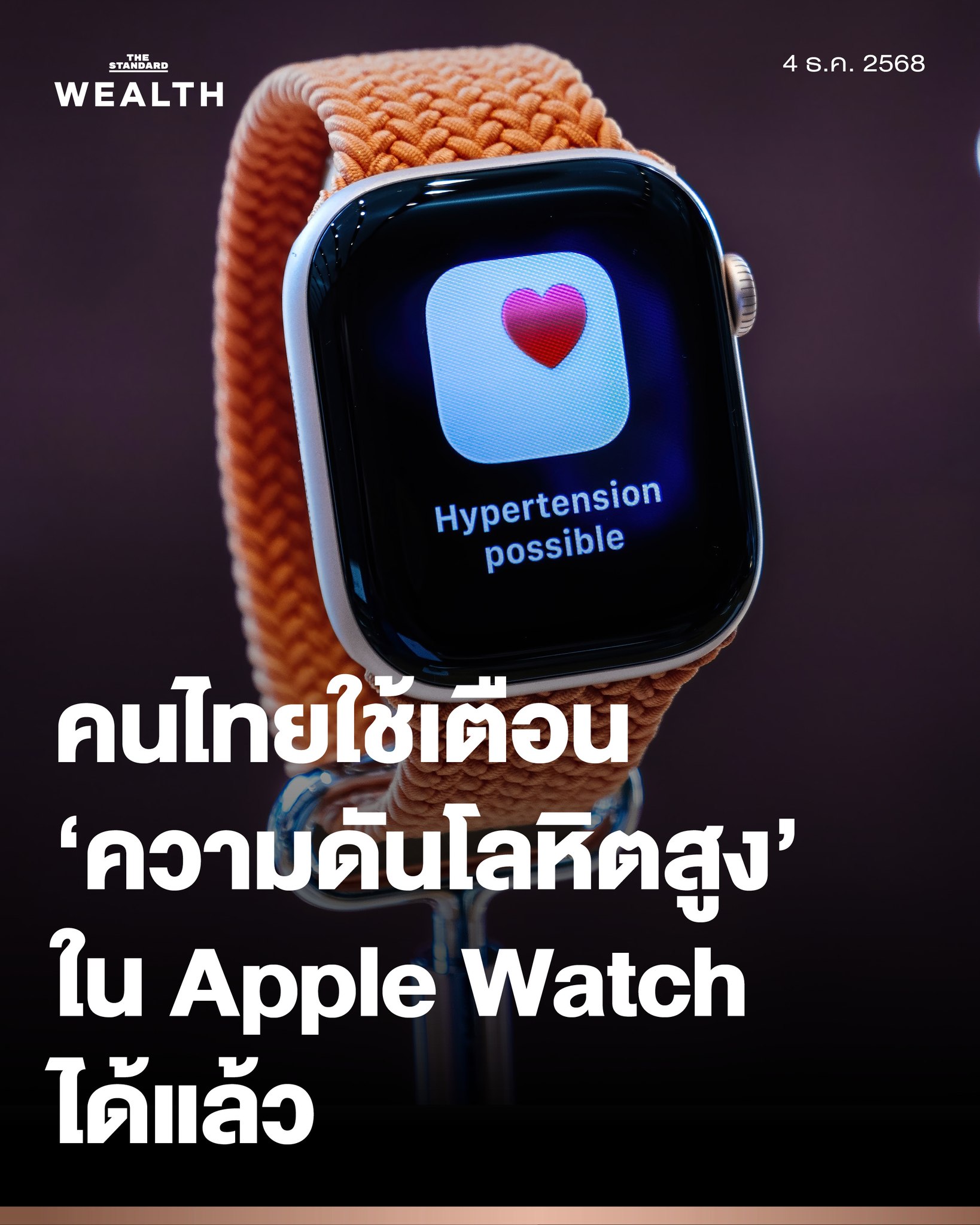 Apple ได้ออกมาเปิดเผยว่า วันนี้ (4 ธ.ค.) ได้เปิดตัวคุณสมบัติ 'การแจ้งเตือนภาวะความดันโลหิตสูง' (hypertension notifications) ในประเทศไทย สำหรับ Apple Watch ซึ่งสามารถแจ้งเตือนผู้ใช้หากตรวจพบสัญญาณของภาวะความดันโลหิตสูงเรื้อรัง หรือ ภาวะความดันโลหิตสูง (hypertension)