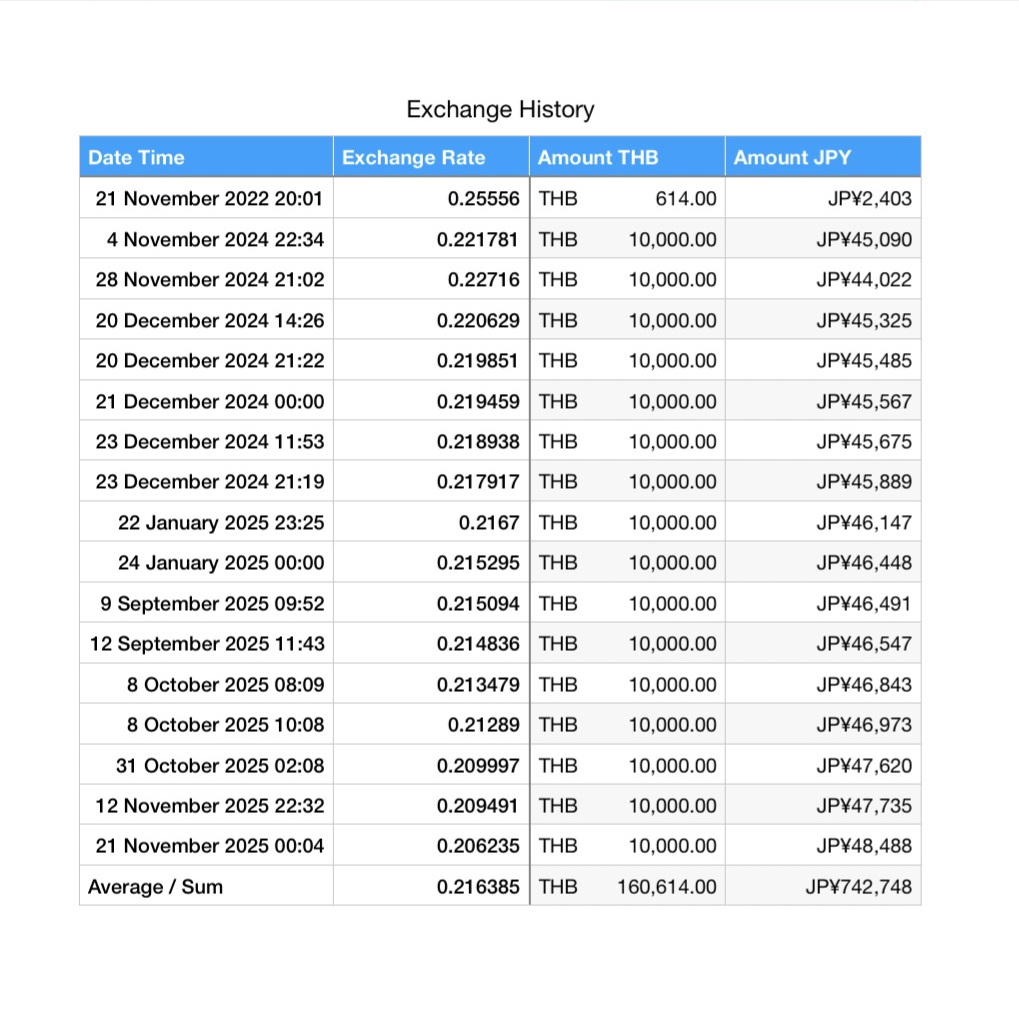 📊 ตารางอัตราแลกเปลี่ยนที่ผมแลกสะสม (พ.ย. 2022 - พ.ย. 2025):