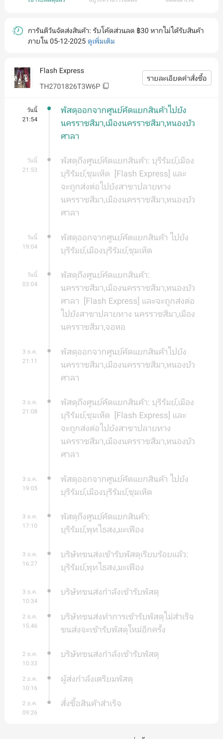 คือเราสั่งของไว้ เจ้าของร้านส่งให้ เมื่อวานจากกรุงเทพมาโคราช ของมาถึงโคราชตั้งแต่ตีสาม ขึ้น"อยู่ระหว่างการขนส่ง" จนตอนนี้15.23เราก็ยังไม่ได้ ของอะคะ คือจะได้ของวันนี้ไหม ทำไมกว่าจะส่งมันช้าจ