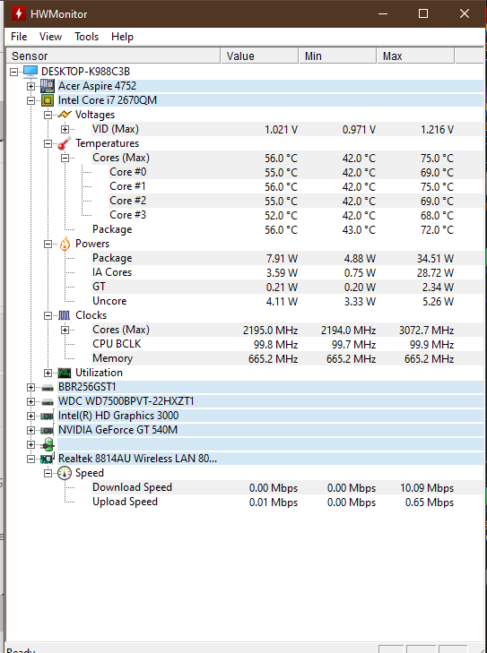 ปรากฏว่าเครื่องตัดจริงๆ จึงได้ทำการโหลด HWmonitor มาเทส ปรากฏว่าเรื่องความร้อนคงไม่เกี่ยว เพราะตอนที่เครื่องตัดอุณหภูมิ MAX 81'C