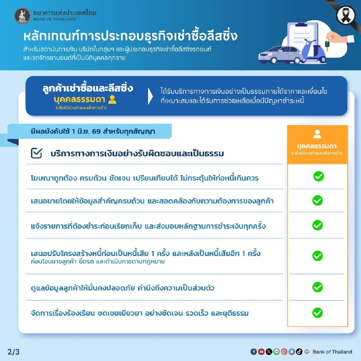 ธปท. ออก 7 หลักเกณฑ์ คุมธุรกิจเช่าซื้อลีสซิ่งฯ รถยนต์-รถจักรยานยนต์ เริ่ม 1/6/69