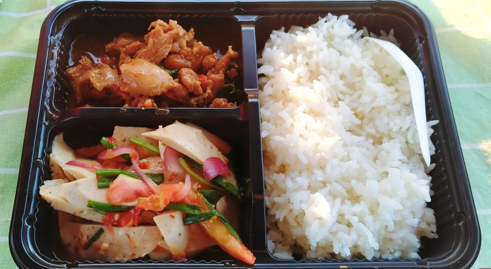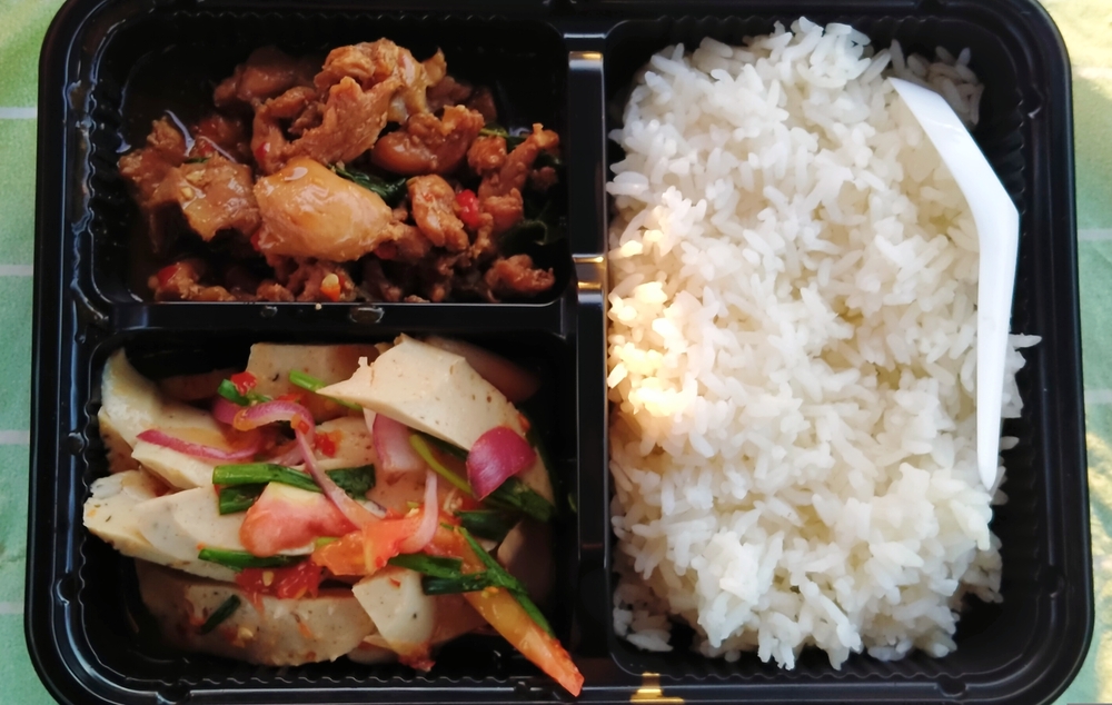 อรุณสวัสดิ์ค่ะวันนี้แวะตลาดเช้าร้านข้าวราดแกงเจ้าประจำ ได้กะเพราไก่ ไข่ลูกเขย ผัดผักเต้าหู้ มาทานค่ะราคากล่องละ 40 บาท (กับ 3 อย่าง) ปิดท้ายด้วยขนมปังแยม ร้านข้างกันกล่องละ 15 บาท (2 ชิ้น)ไส้ฉ่ำอร่อ