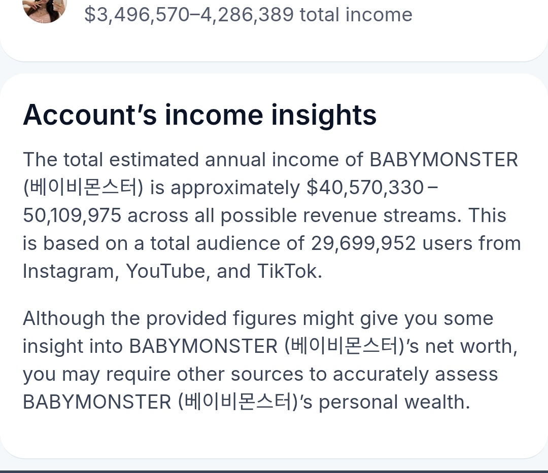 นักวิเคราะห์จากตลาดหลักทรัพย์เกาหลีประเมินว่า BABYMONSTER จะมีรายได้เฉพาะที่ได้รับจากการสตรีมเท่านั้นประมาณ 40-50 ล้านยูเอสดอลล่าร์