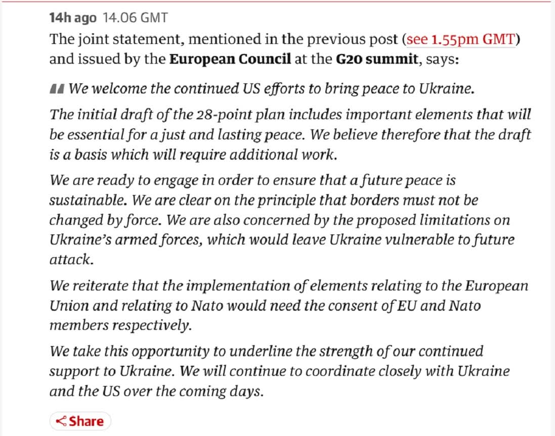 🟪 🇪🇺 ในการประชุมสุดยอด G20 ผู้นำประเทศในยุโรป รวมถึงแคนาดาและญี่ปุ่น รวมตัวกันที่แอฟริกาใต้ เมื่อวันเสาร์ ระบุในแถลงการณ์ร่วม คัดค้านแผนของทรัมป์ โดยระบุว่า :