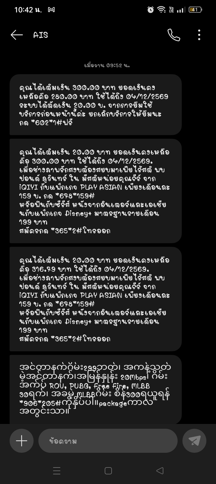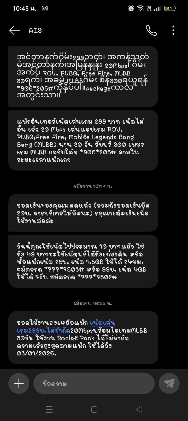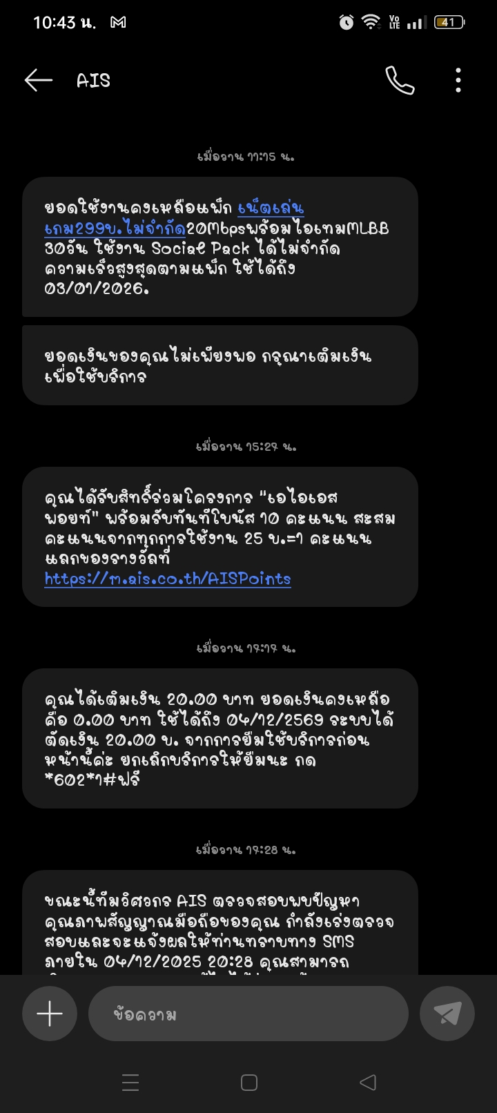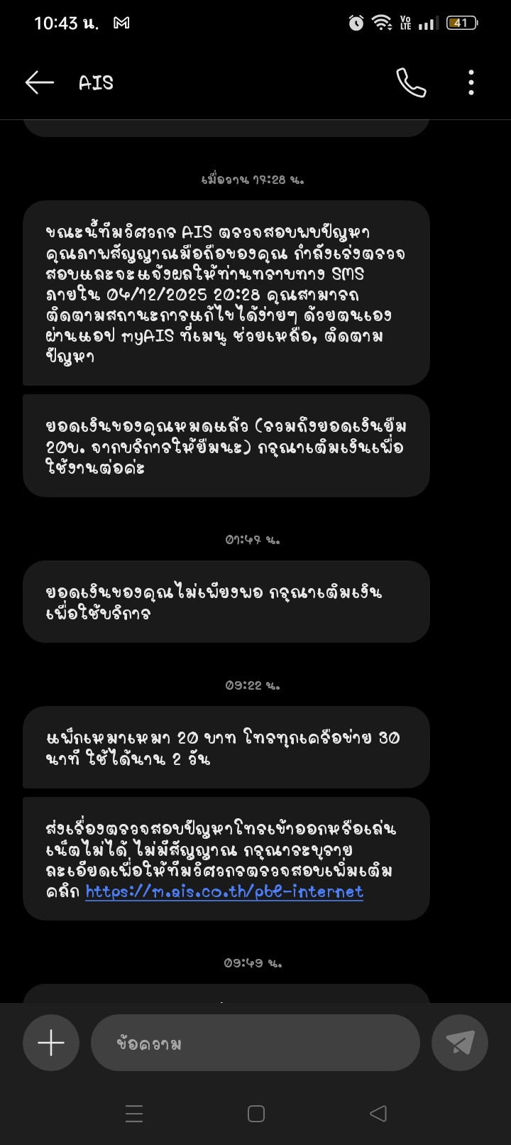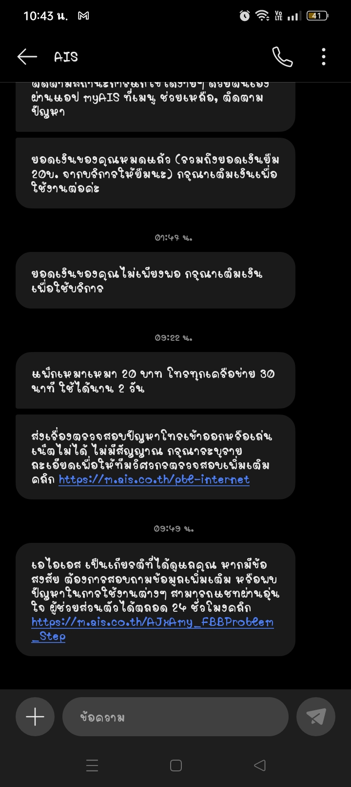 สวัสดีค่ะ คือว่าเราได้เติมเน็ตของค่ายนี้ไปเมื่อวานตอน9โมงกว่าๆ เกือบจะ10โมง แล้วก็มีแจ้งเตือน sms เป็นชื่อแพ็กเกจของเรา แต่ว่าพอเราเปิดอินเตอร์เน็ตมือถือ กลับขึ้นว่าถึงขีดจำกัดการใช้อินเตอร์เน็ต แล้วก็หักค่ายืมเน็ตเราไป ทั้งๆที่เรามีแพ็กเกจอยู่แล้ว เราได้ลองทั้งการเปิดโหมกเครื่องบิน รีเครื่องหลายรอบ เราโทรหา1175ไป ก็ต้องรอสายพนักงานซึ่งนานมากๆ และเปลืองเงินค่าโทรสุดๆ เราก็ไปแจ้งปัญหาในแอพ Myais ต่อแล้ว มันบอกจะเสร็จสิ้นภายใน23 เดือนนี้ แต่แบบว่ามันนานมากๆ เราไม่รู้จะทำยังไง สำหรับเราเงินมันก็ไม่ใช่น้อยๆด้วย เพราะเสียค่าโทรไปด้วย แถมเรายังโดนหักค่าเน็ตยืมไป คือตอนนี้อยากได้เงินคืน ถ้าไม่ได้เงินคืนก็อยากให้เน็ตใช้งานได้ แล้วจะแก้หรือทำยังไงดี เพราะถ้าเราไม่ทำอะไรเบยจะเสีย300เกือบ400ไปฟรีๆโดยไม่ได้อะไรกลับมาหรอคะ