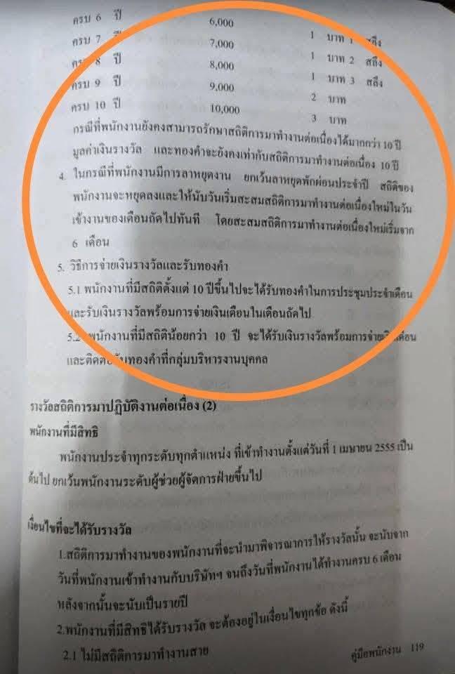 ย้ำอีกครั้ง ประเด็นคือบริษัทประกาศใน "คู่มือพนักงาน" ว่าใครขยัน ไม่เคยมาสาย และไม่เคยลาหยุดครบ 10 ปี จะได้ "ทอง 3 บาทและเงิน 1 หมื่น"