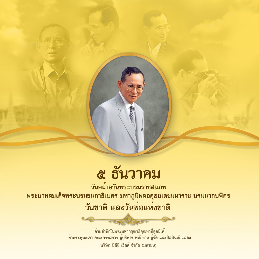 💛 พระบาทสมเด็จพระบรมชนกาธิเบศร มหาภูมิพลอดุลยเดชมหาราช บรมนาถบพิตร เป็นพระมหากษัตริย์ไทย รัชกาลที่ ๙ แห่งพระบรมราชจักรีวงศ์ เสด็จพระราชสมภพ เมื่อวันที่ ๕ ธันวาคม ๒๔๗๐ เป็นพระราชโอรสในสมเด็จพระมหิตลาธิเบศร อดุลยเดชวิกรม พระบรมราชชนก กับสมเด็จพระศรีนครินทราบรมราชชนนี มีสมเด็จพระโสทรเชษฐภคินี คือ สมเด็จพระเจ้าบรมวงศ์เธอ เจ้าฟ้ากัลยาณิวัฒนา กรมพระนราธิวาสราชนครินทร์ บดินทรเชษฐภคินี และสมเด็จพระบรมเชษฐาธิราช คือ พระบาทสมเด็จพระปรเมนทรมหาอานันทมหิดล พระอัฐมรามาธิบดินทร รัชกาลที่ ๘ โดยเสด็จขึ้นครองราชย์ เมื่อวันที่ ๙ มิถุนายน ๒๔๘๙ ด้วยพระปรมาภิไธย “พระบาทสมเด็จพระปรมินทรมหาภูมิพลอดุลยเดช มหิตลาธิเบศรรามาธิบดี จักรีนฤบดินทร สยามินทราธิราช บรมนาถบพิตร” และเสด็จสวรรคต เมื่อวันที่ ๑๓ ตุลาคม ๒๕๕๙ เวลา ๑๕.๕๒ น. ณ โรงพยาบาลศิริราช สิริพระชนมพรรษาปีที่ ๘๙ ทรงครองราชสมบัติได้ ๗๐ ปี