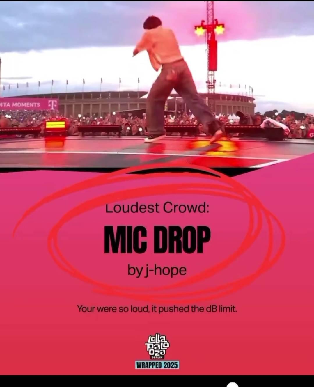 การแสดงเพลง "Mic Drop" ของเจโฮปในงาน Lollapalooza Berlin ได้รับการยกย่องให้เป็นช่วงเวลาที่ฝูงชนส่งเสียงดังที่สุดของ Lollapalooza Berlin ปี 2025
