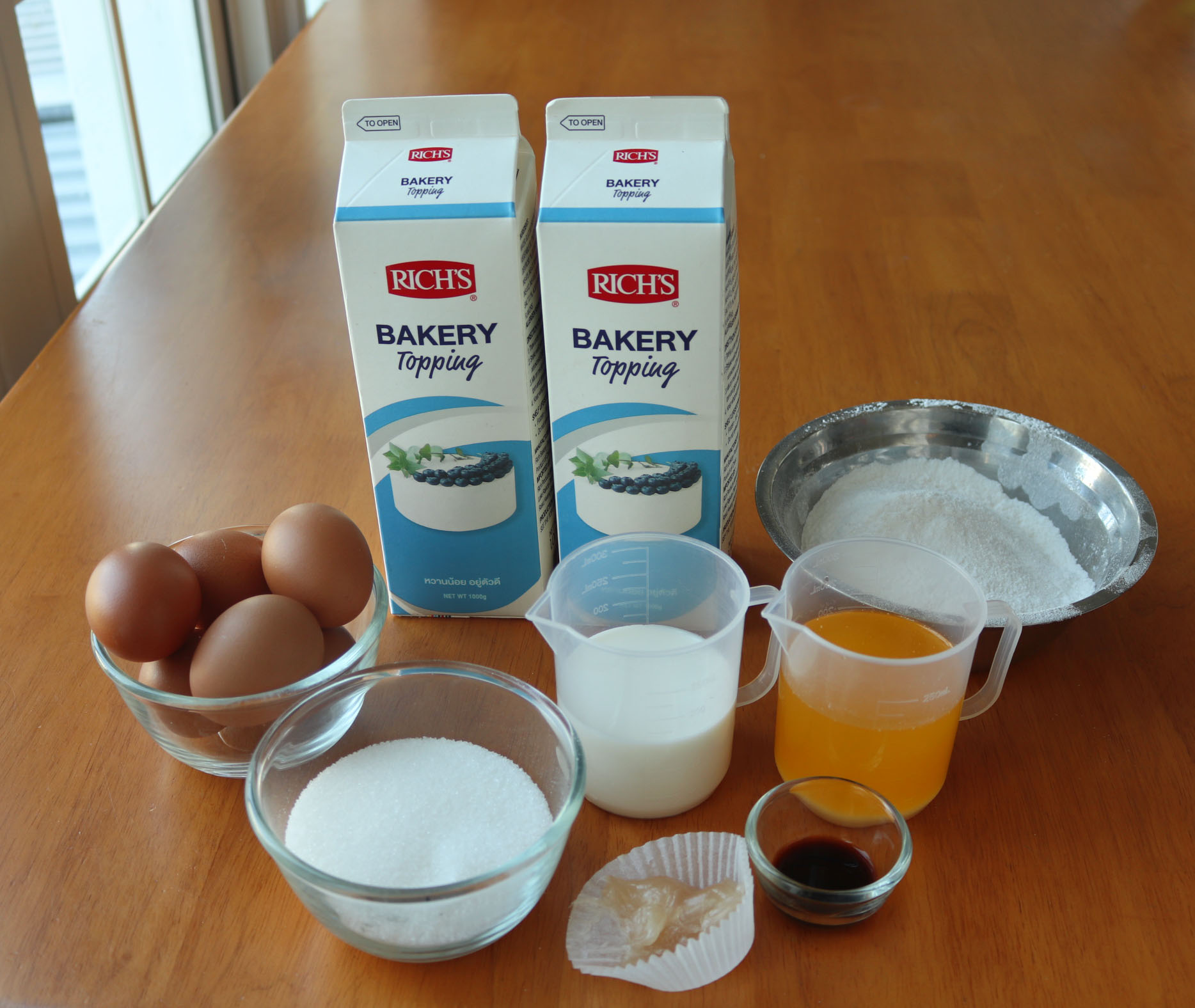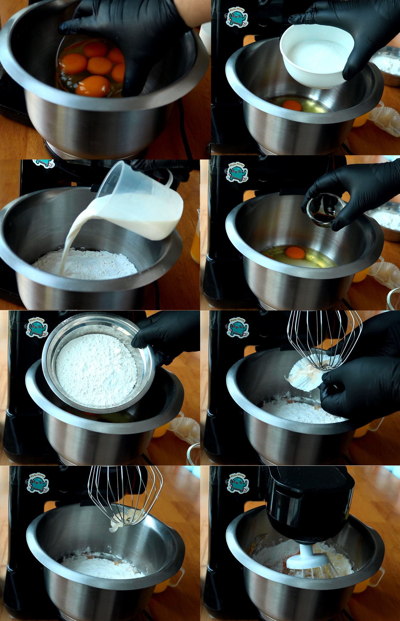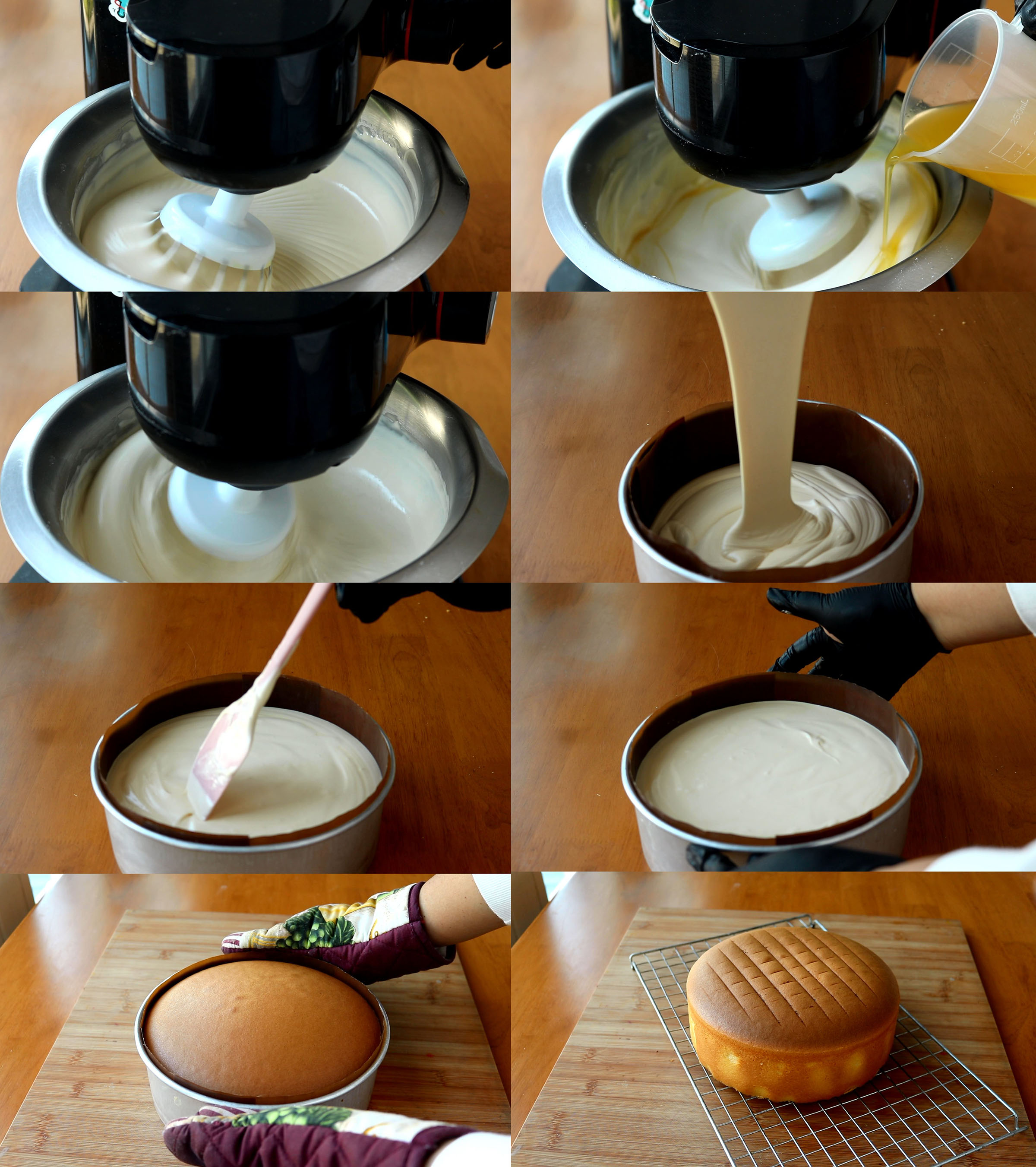 1.ใส่ไข่ไก่ น้ำตาลทราย แป้งที่ร่อนพร้อมผงฟู วานิลลา SP ลงไป ตีจนเค้กขึ้นฟู